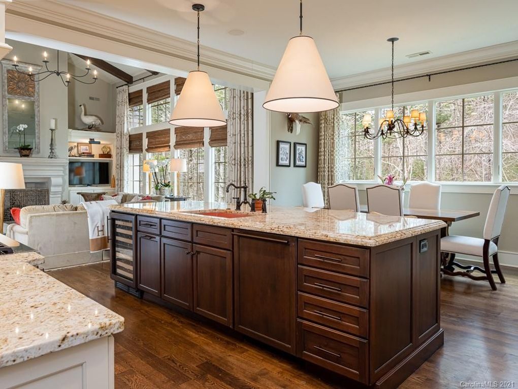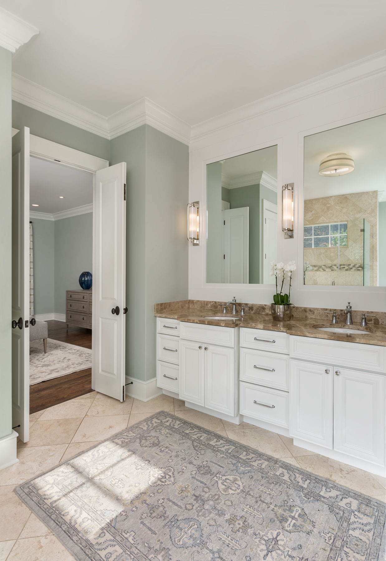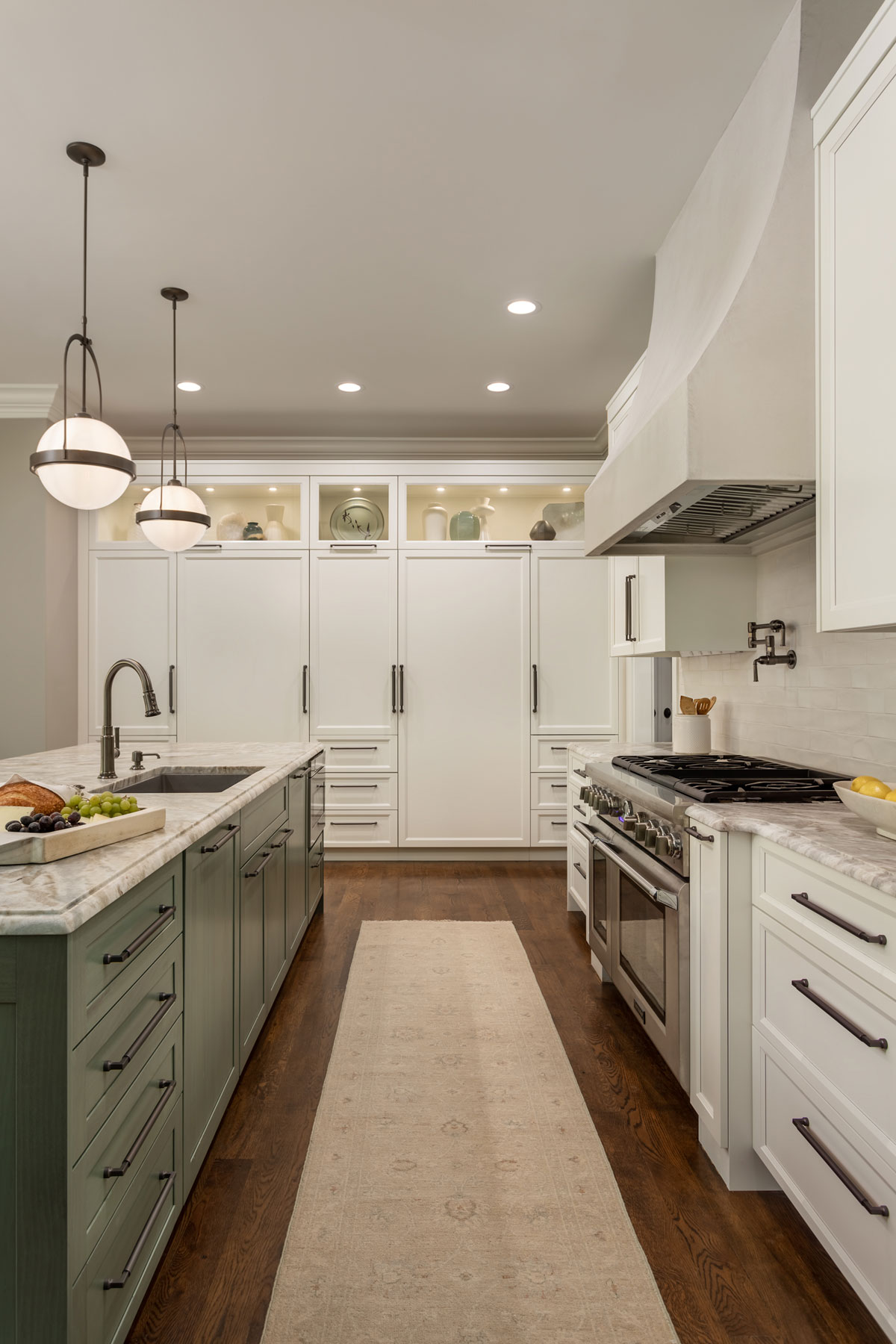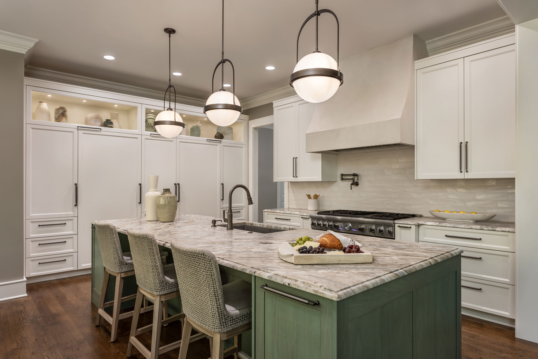 The home is now transformed to a more transitional style, with a new and more functional Kitchen for an avid cook. Previously, the house didn’t include enough storage for all of the owners’ dishes, small appliances, and various cooking tools and utensils. Storage was added in the new Kitchen design and the new laundry room cabinetry, while a custom coffee station was added in a hallway and includes display space for vintage glassware.
