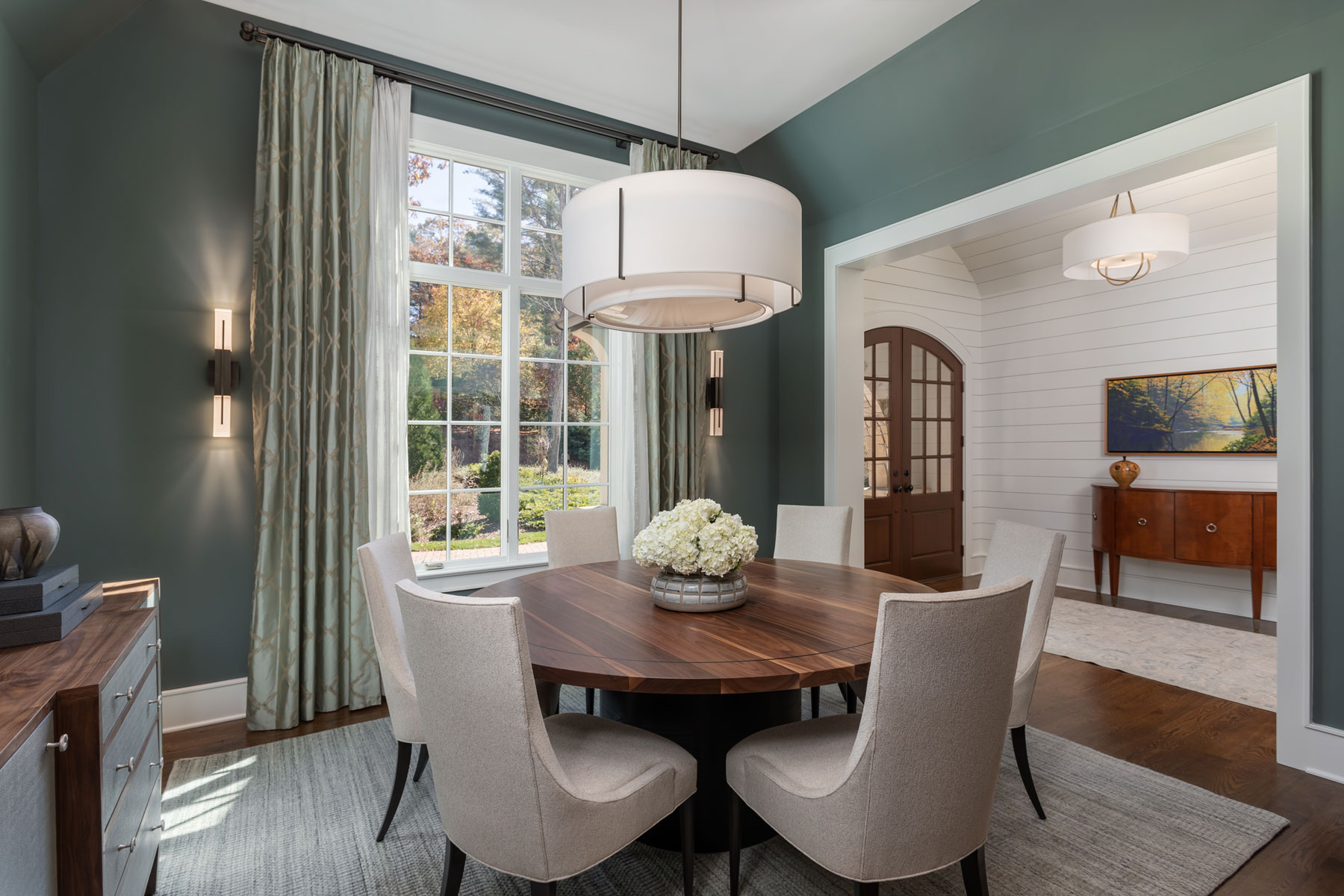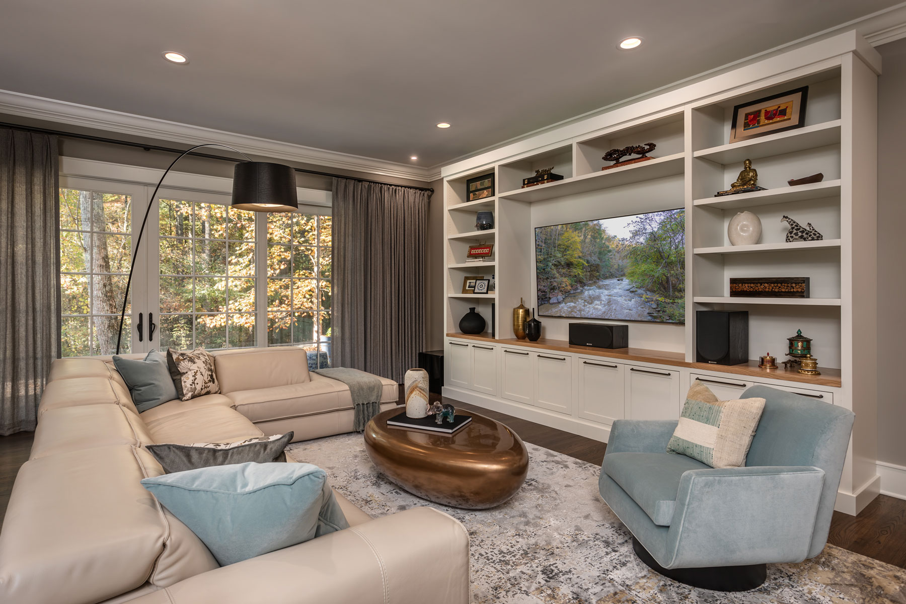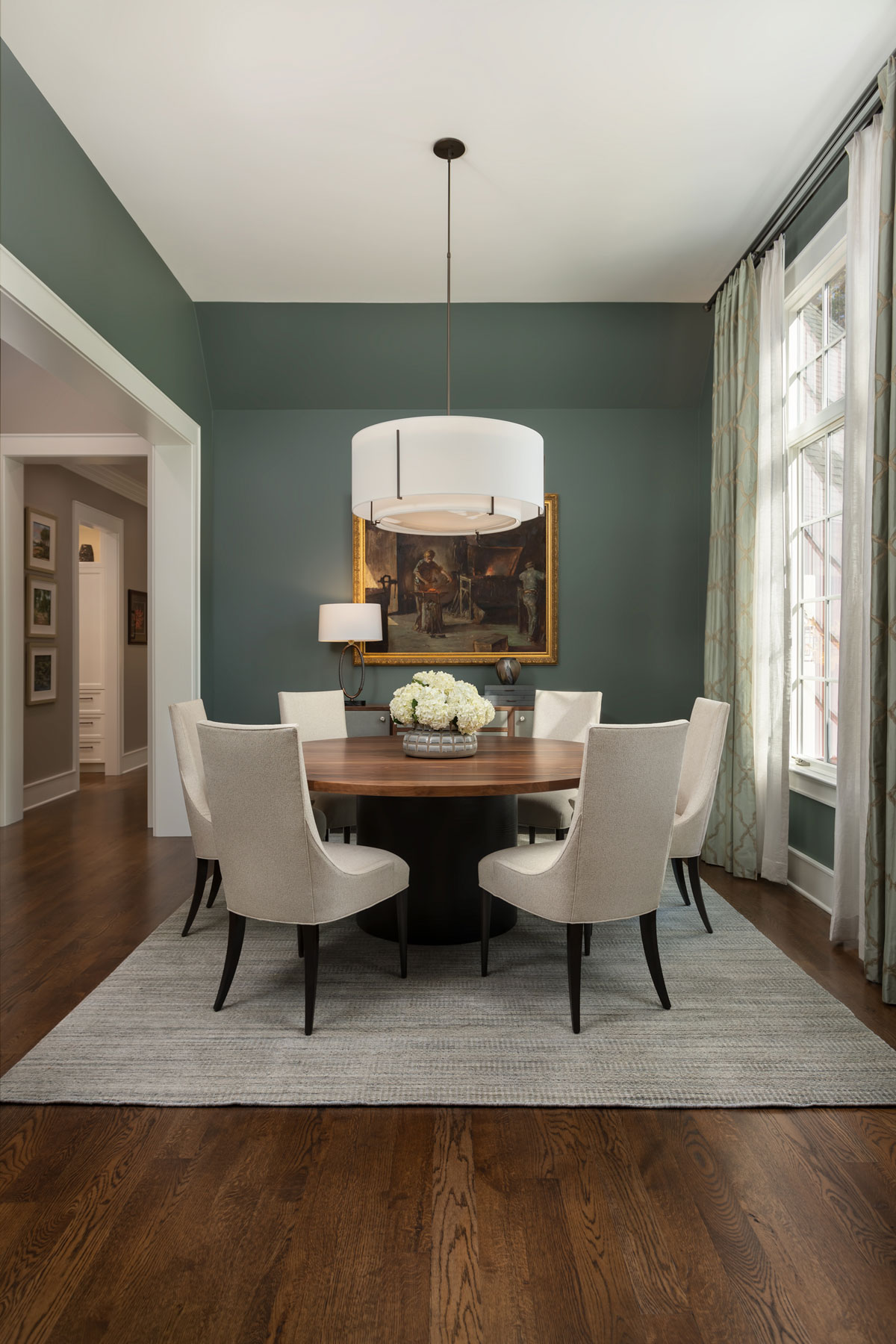 Custom furniture was designed in a few key locations, including the Dining Room, which greets visitors just off the Foyer. The 72″ round walnut table is a statement piece, and pairs well with the client’s new chairs, existing oil painting, and custom drapery. A custom nesting coffee table set and sideboard were also commissioned for the Living Room. A+R is proud to pair clients with an extensive network of architects, builders, furniture makers, work rooms, artists, artisans and craftsmen to personalize each home to the client’s individual tastes, as we did in this case.