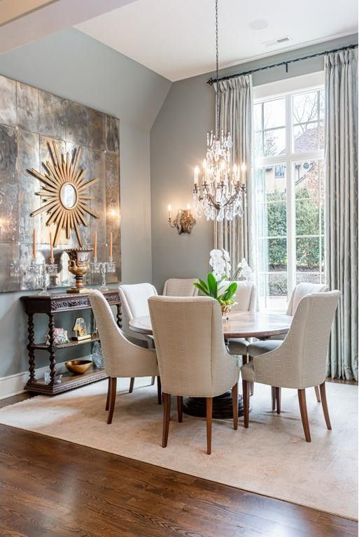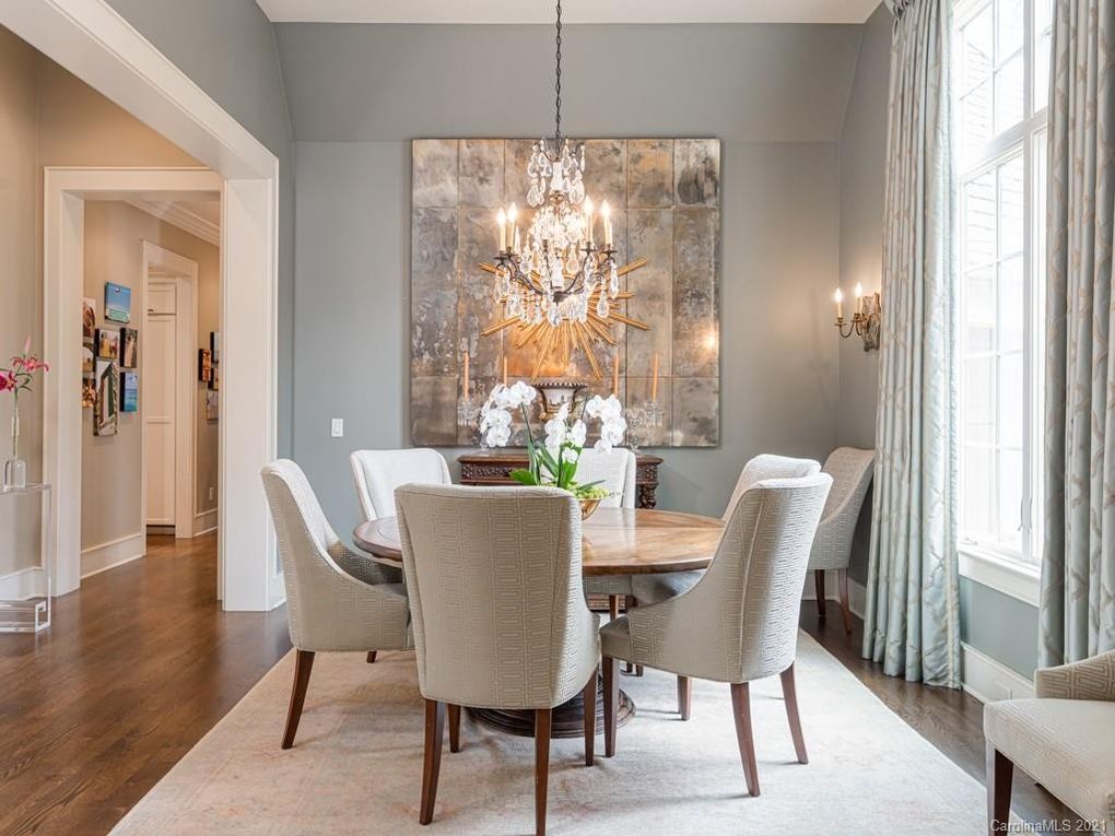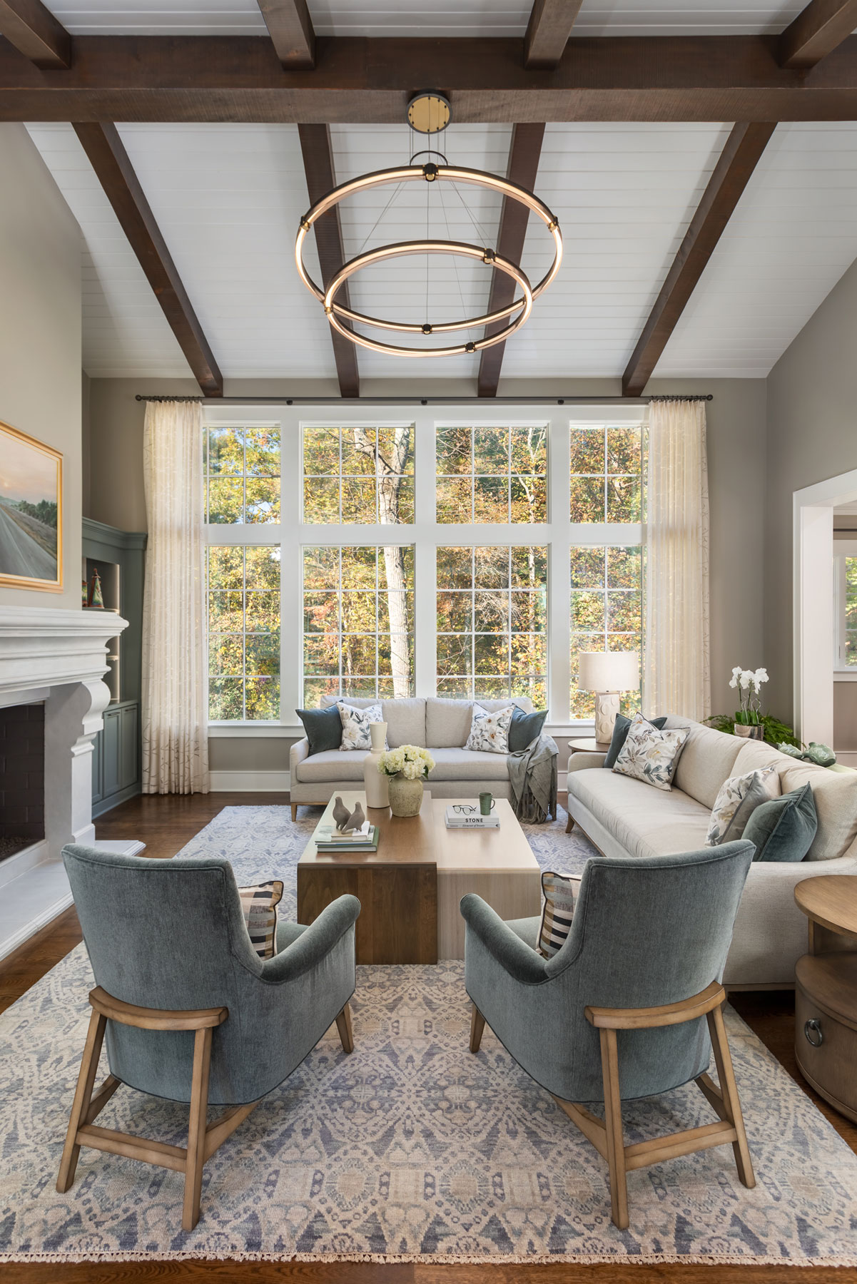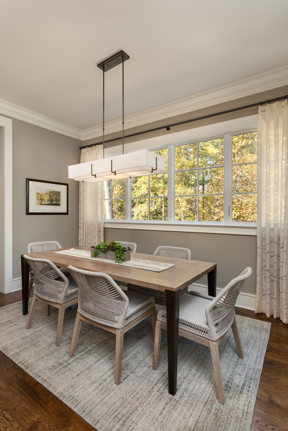 Custom furniture was designed in a few key locations, including the Dining Room, which greets visitors just off the Foyer. The 72″ round walnut table is a statement piece, and pairs well with the client’s new chairs, existing oil painting, and custom drapery. A custom nesting coffee table set and sideboard were also commissioned for the Living Room. A+R is proud to pair clients with an extensive network of architects, builders, furniture makers, work rooms, artists, artisans and craftsmen to personalize each home to the client’s individual tastes, as we did in this case.