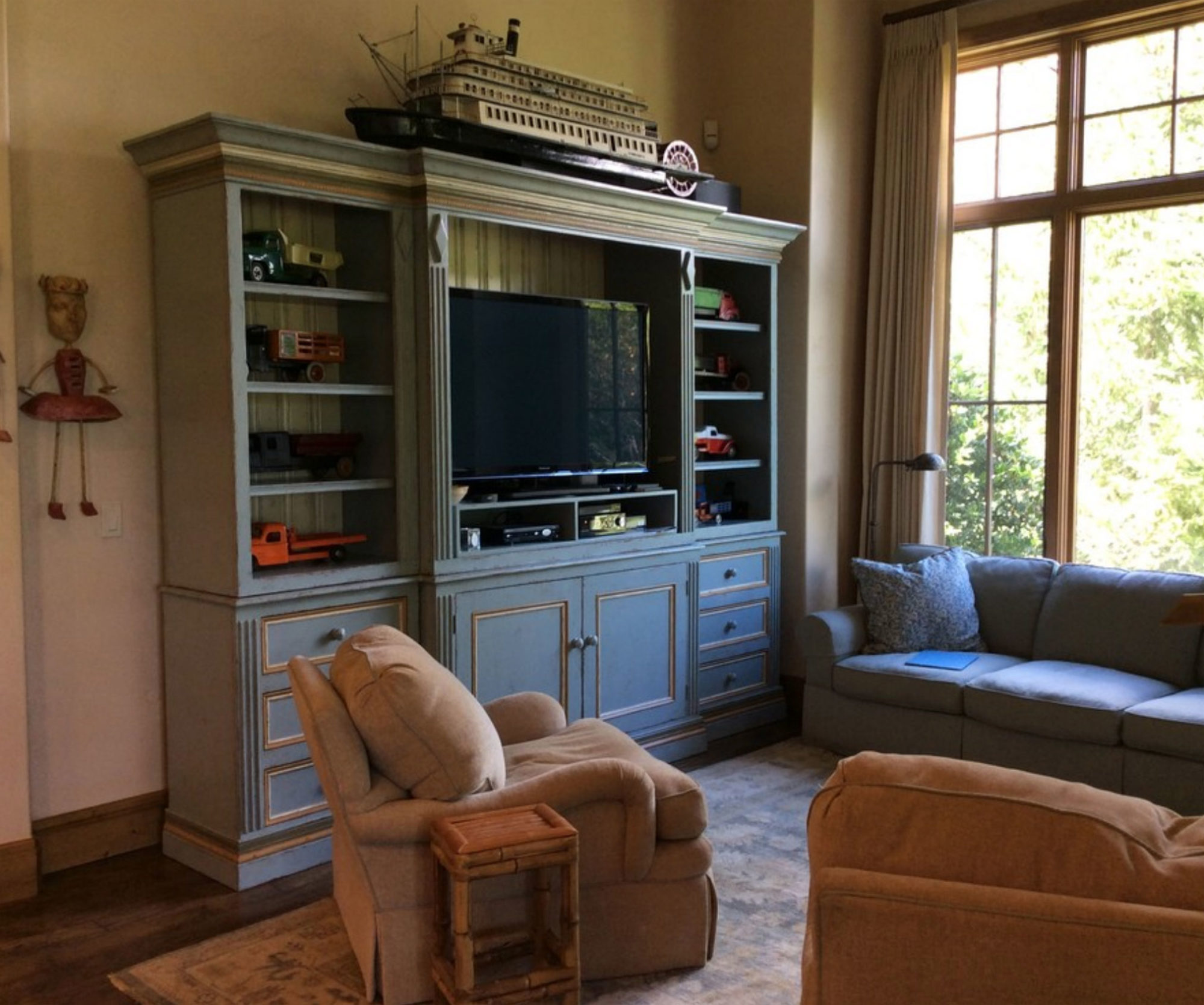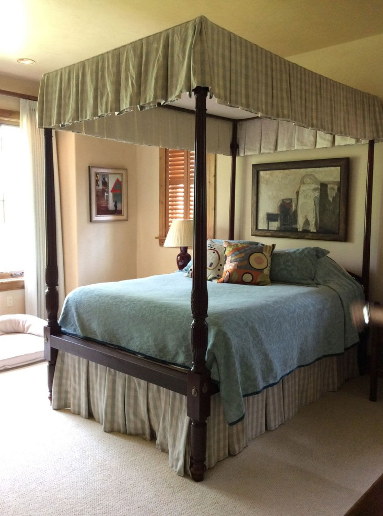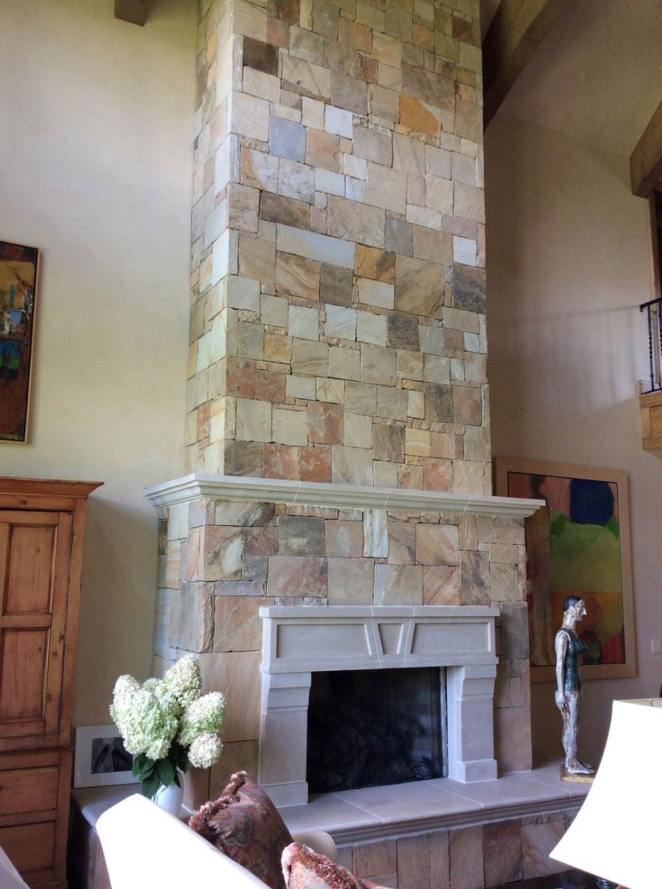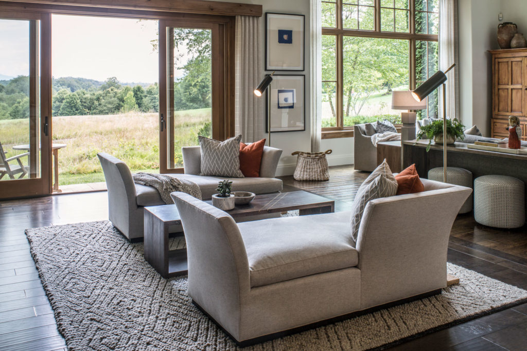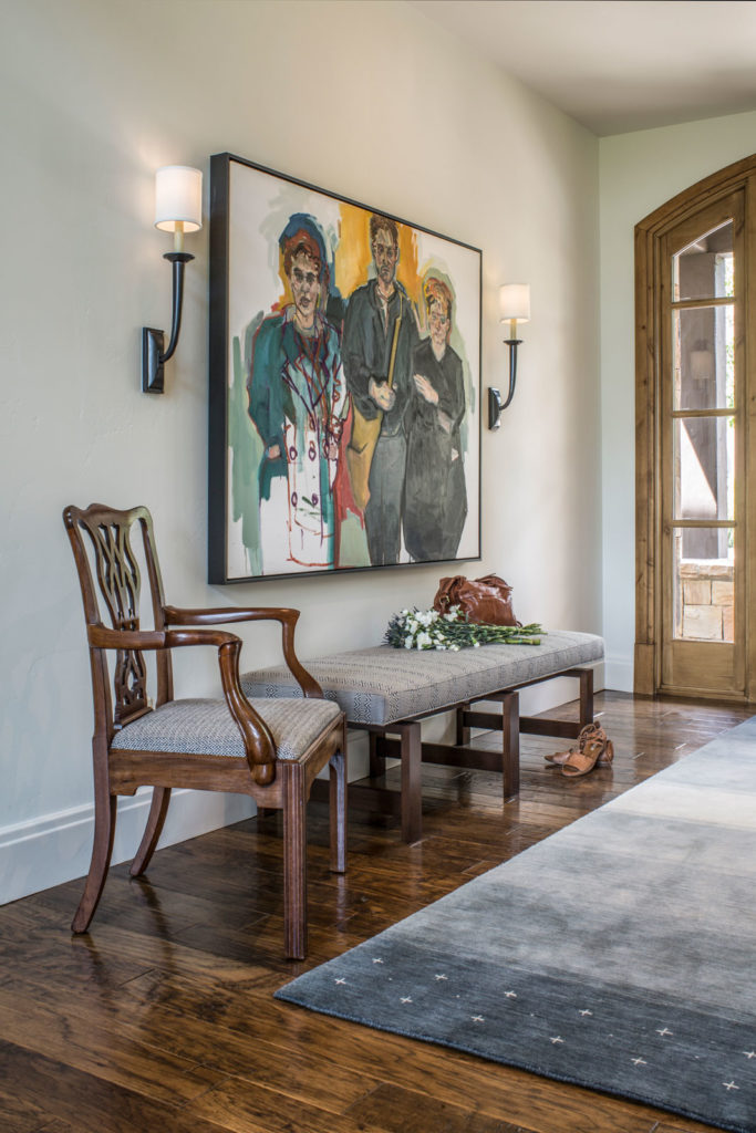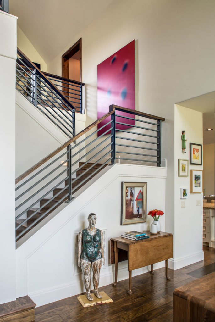 An existing town home was in need of an update to better reflect our client’s sophisticated taste, and to house their extensive collection of antiques, contemporary art and sculpture. An existing porch was enclosed off the original dining area, and with new sliding doors now acts as a sitting room and houses the tv. The original tv space with vaulted ceiling off of the kitchen, has become the new Dining Room. In the Living Room the fireplace was re-clad in silver travertine. Other updates including painting the walls and trim, replacing the stair railing, new furniture and reupholstering, updating decorative lighting, and renovating the Powder Bath. The end result is a space now bathed in natural light, open to the mountain views, and serves as a perfect stage for entertaining or simply relaxing with a good book.