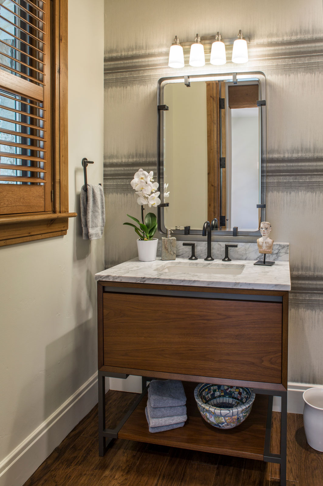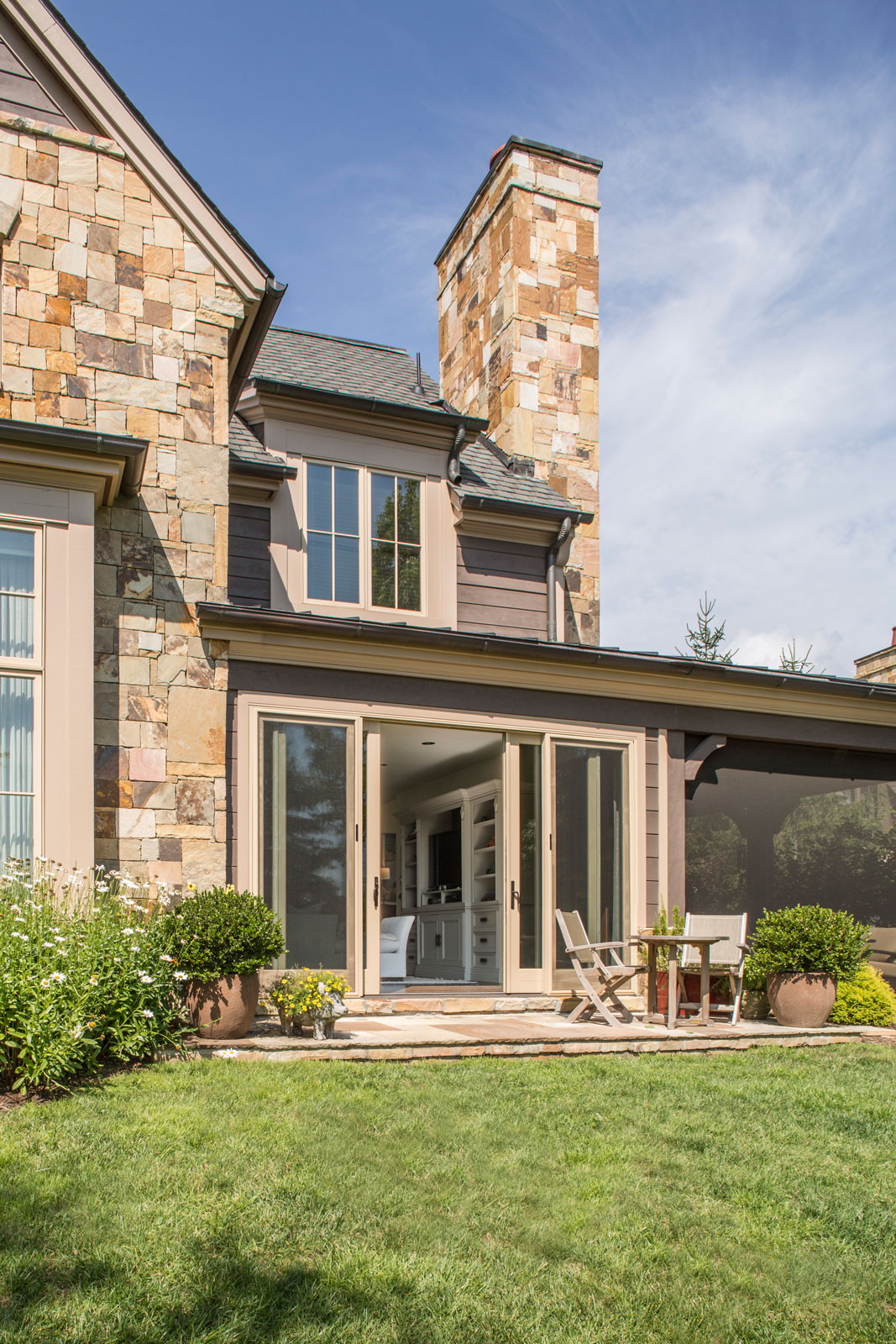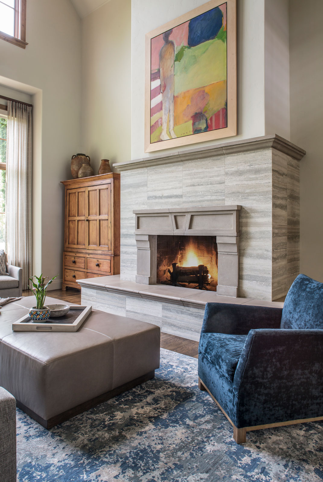An existing town home was in need of an update to better reflect our client’s sophisticated taste, and to house their extensive collection of antiques, contemporary art and sculpture. An existing porch was enclosed off the original dining area, and with new sliding doors now acts as a sitting room and houses the tv. The original tv space with vaulted ceiling off of the kitchen, has become the new Dining Room. In the Living Room the fireplace was re-clad in silver travertine. Other updates including painting the walls and trim, replacing the stair railing, new furniture and reupholstering, updating decorative lighting, and renovating the Powder Bath. The end result is a space now bathed in natural light, open to the mountain views, and serves as a perfect stage for entertaining or simply relaxing with a good book.