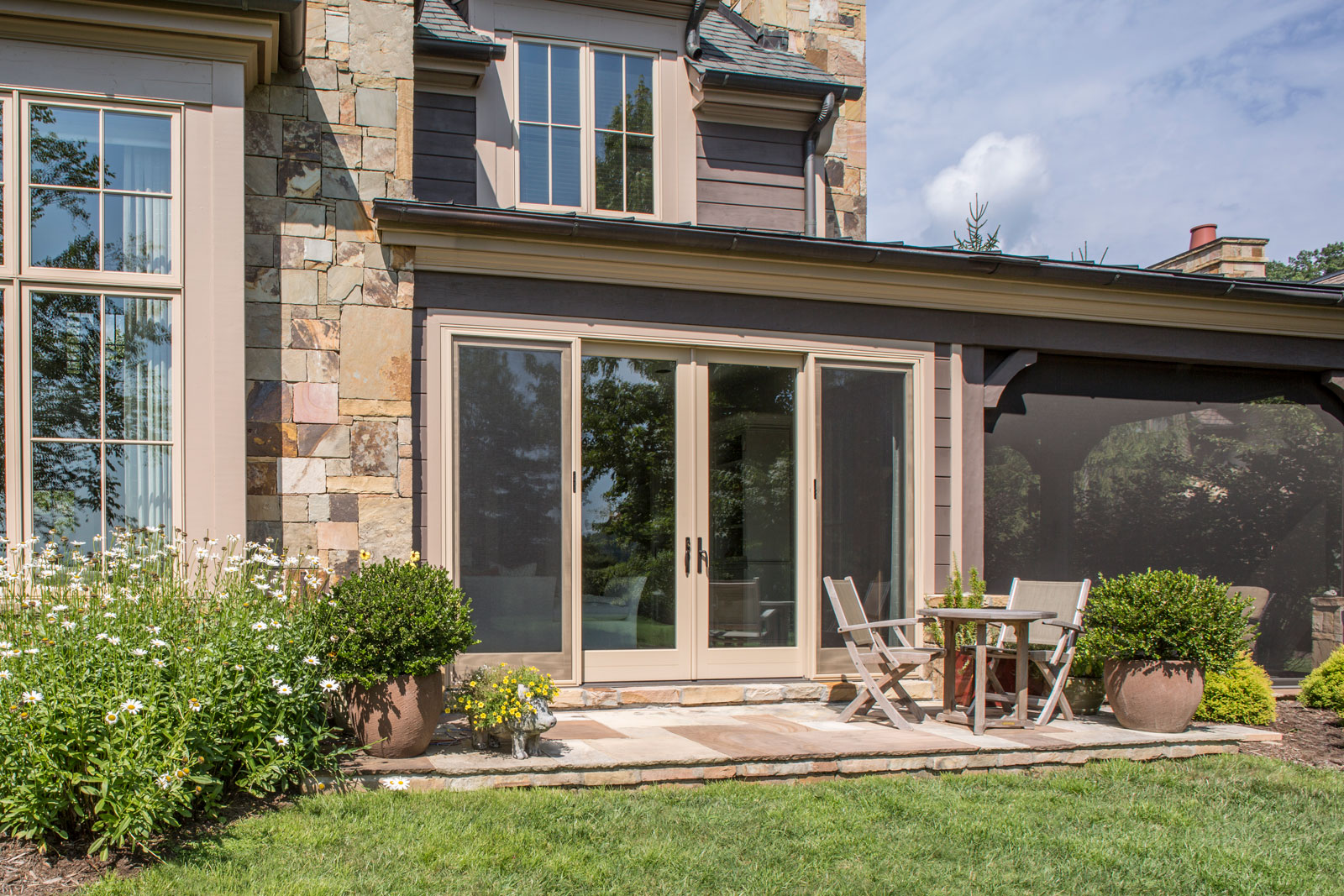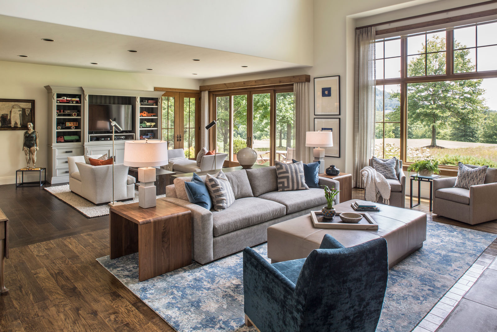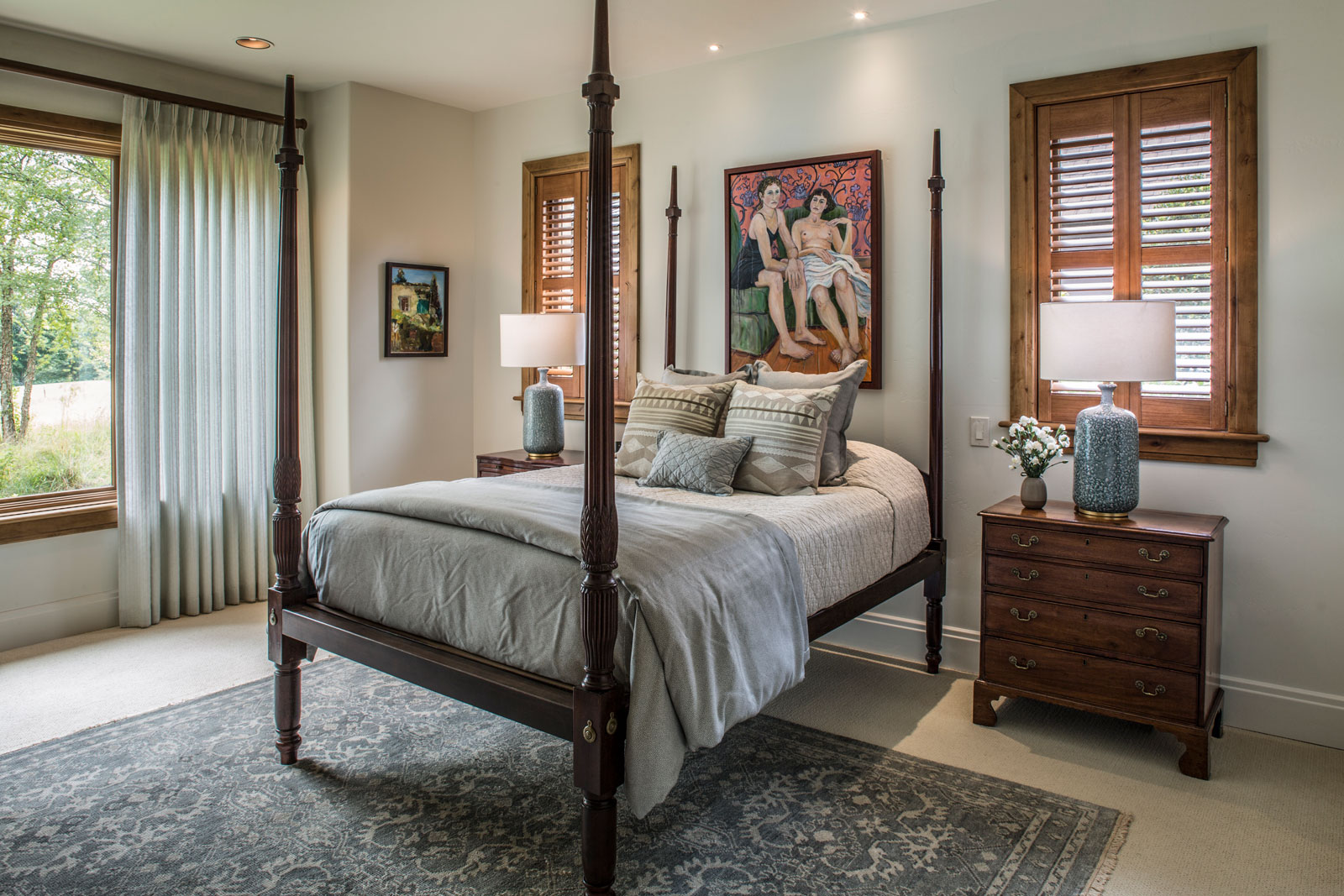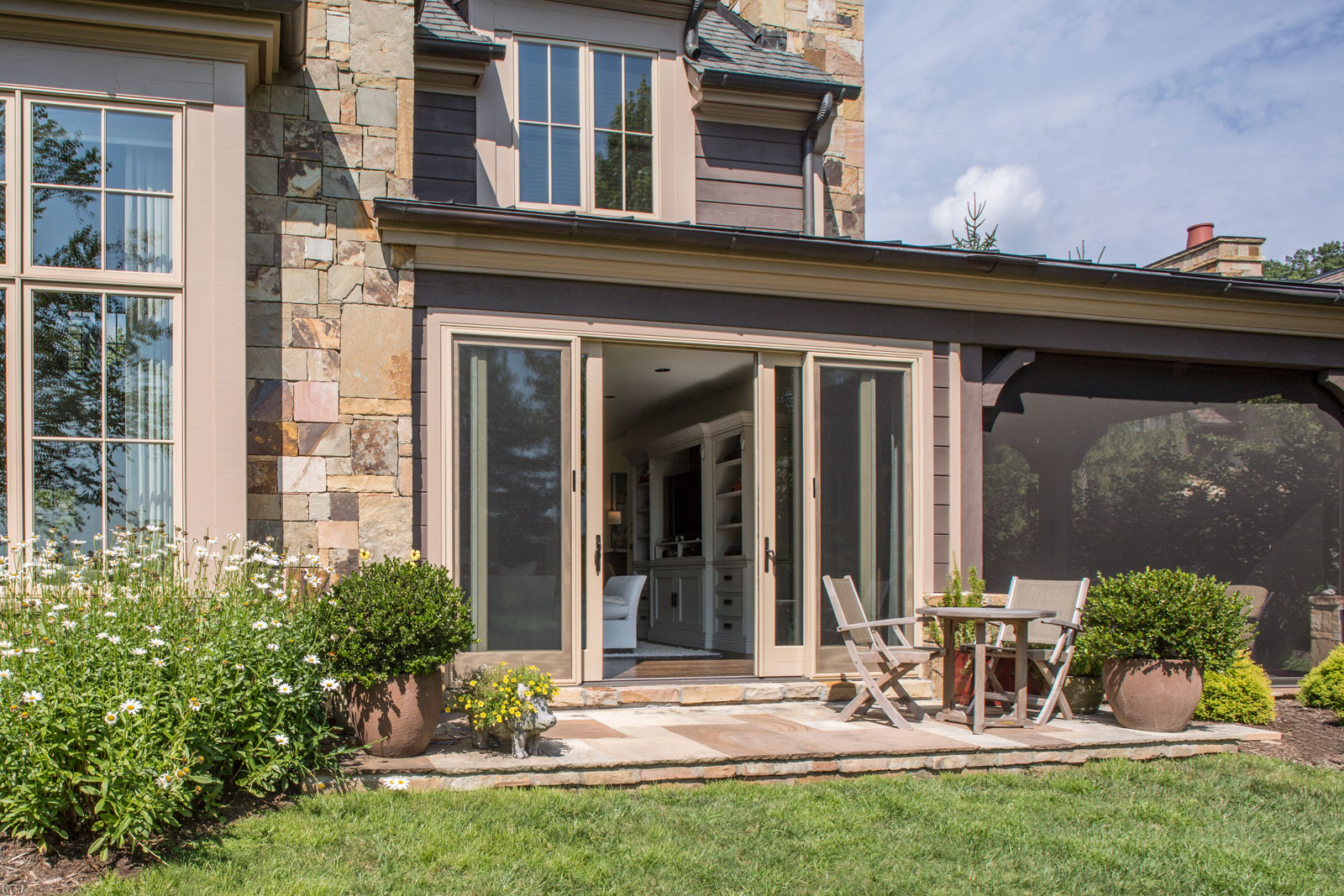 An existing town home was in need of an update to better reflect our client’s sophisticated taste, and to house their extensive collection of antiques, contemporary art and sculpture. An existing porch was enclosed off the original dining area, and with new sliding doors now acts as a sitting room and houses the tv. The original tv space with vaulted ceiling off of the kitchen, has become the new Dining Room. In the Living Room the fireplace was re-clad in silver travertine. Other updates including painting the walls and trim, replacing the stair railing, new furniture and reupholstering, updating decorative lighting, and renovating the Powder Bath. The end result is a space now bathed in natural light, open to the mountain views, and serves as a perfect stage for entertaining or simply relaxing with a good book.