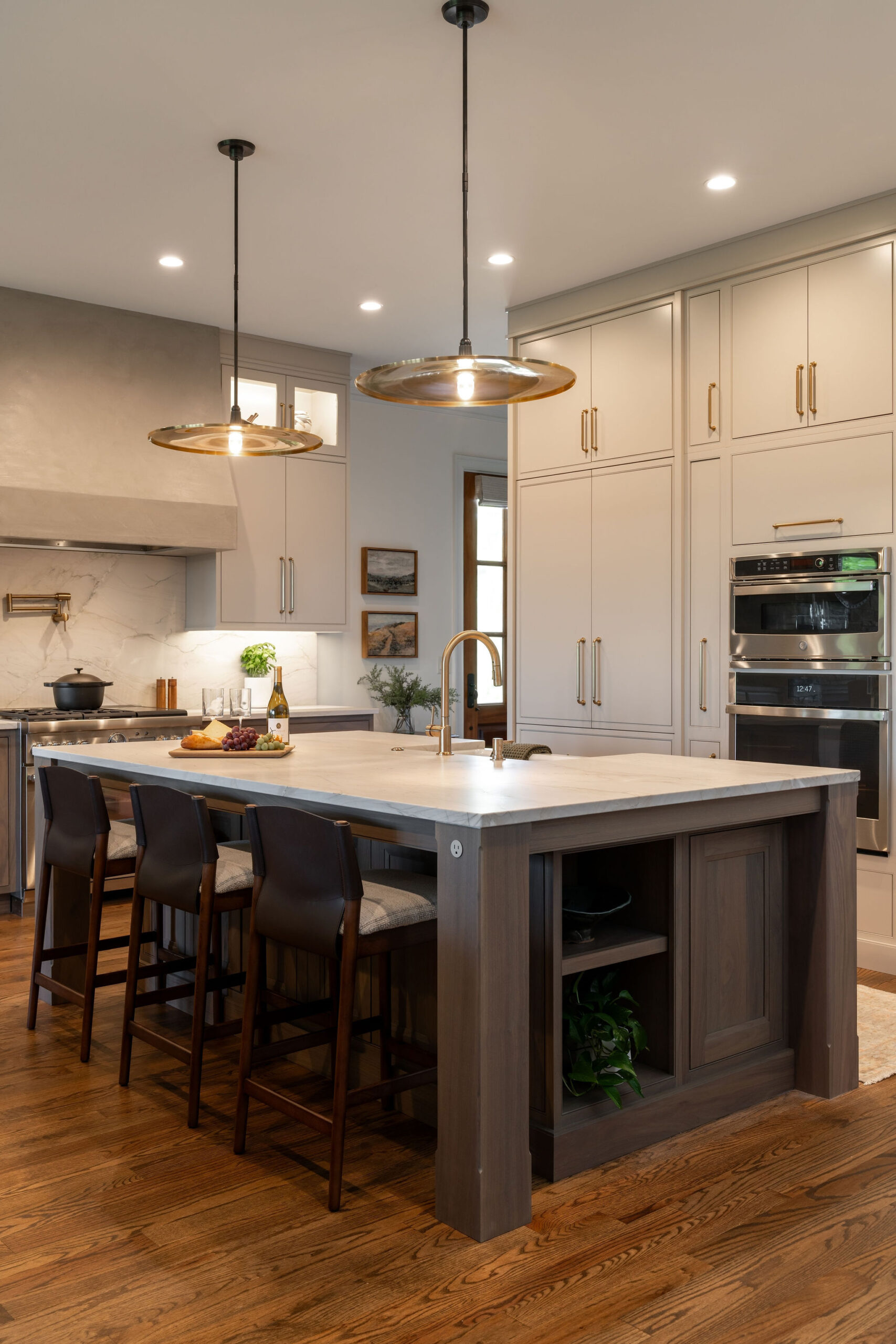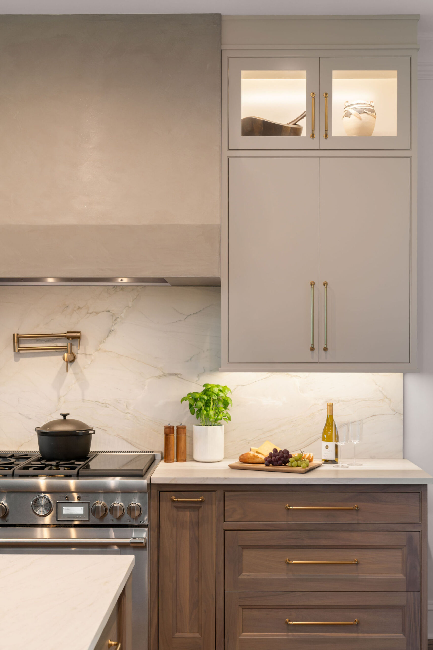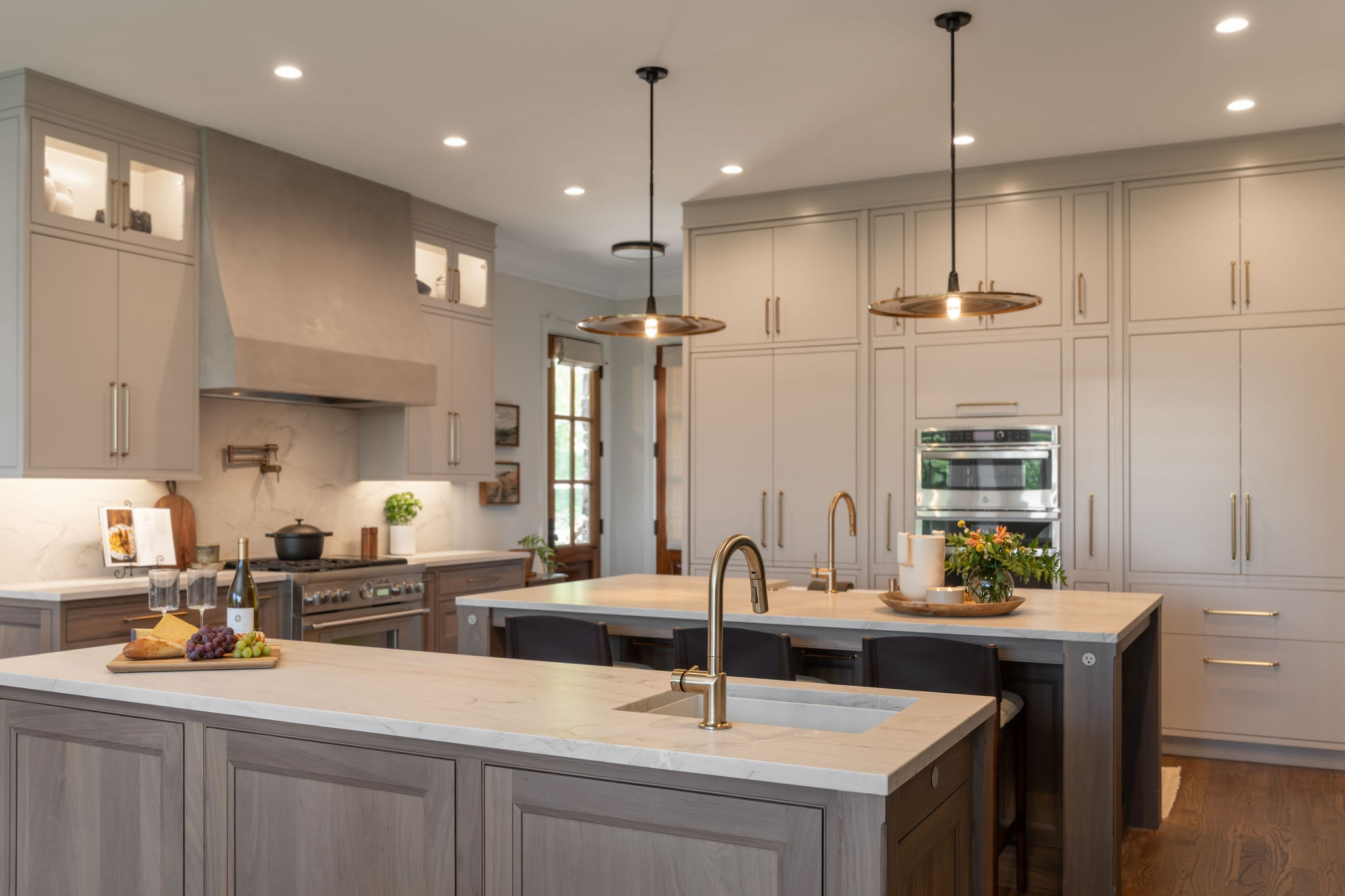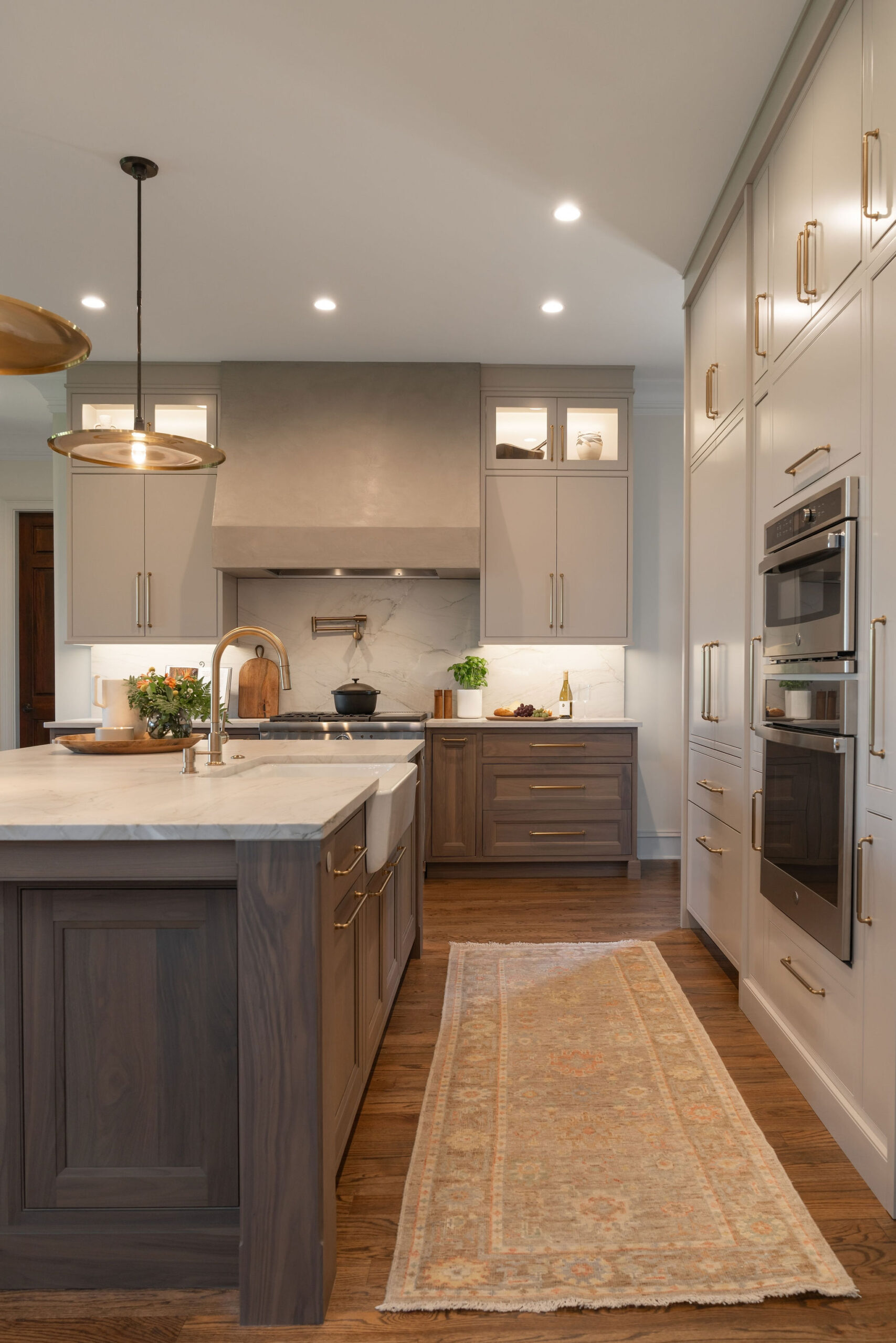 We began by reimagining the Kitchen layout. New fully integrated appliances were clad in cabinet panels to blend in with the surrounding cabinets. A two-tone finish palette was selected for the new cabinetry, with bases in walnut while the uppers and the appliance wall are painted. A new plaster hood anchors the cooking wall, as two islands float between the Living, Dining and Sitting Room spaces adjacent to the Kitchen. One island is dedicated to food prep and house the Kitchen sink and dishwasher, while the other is an entertaining island with refrigerator and freezer drawers, a wine cooler, and a bar sink and faucet.