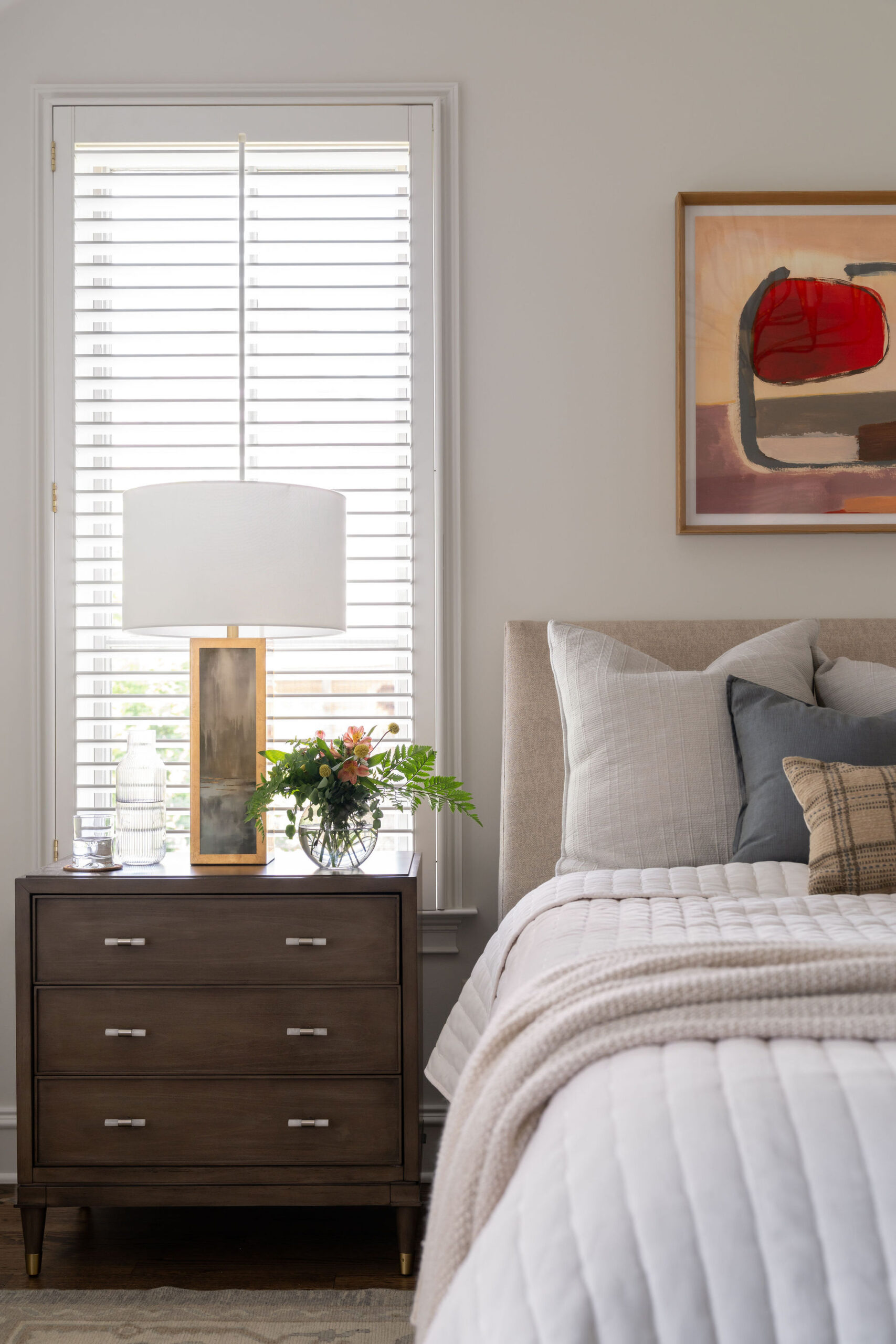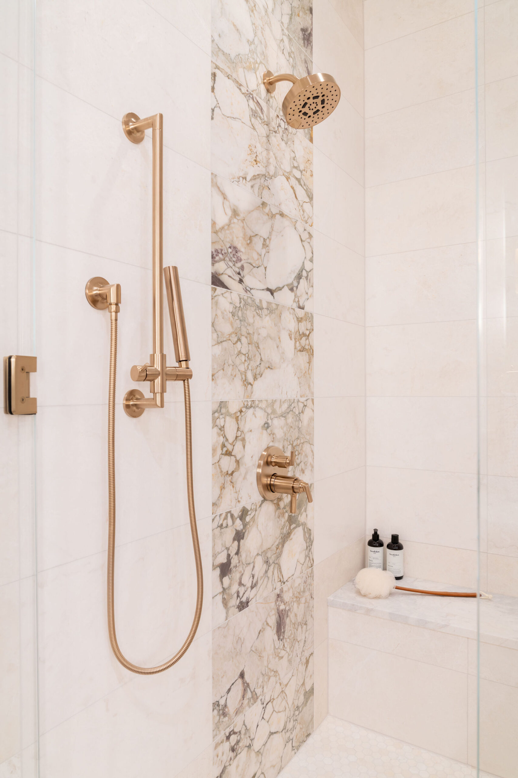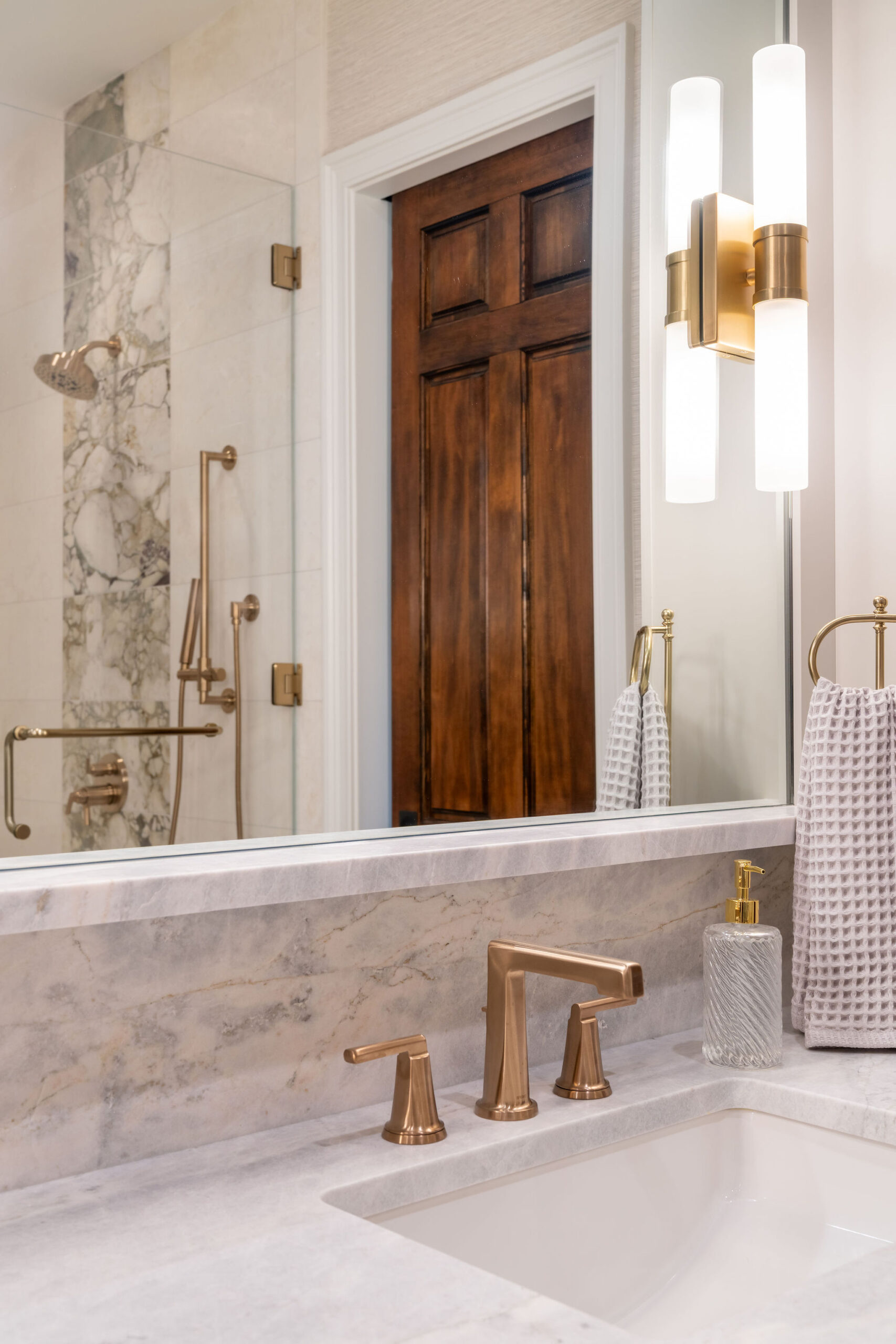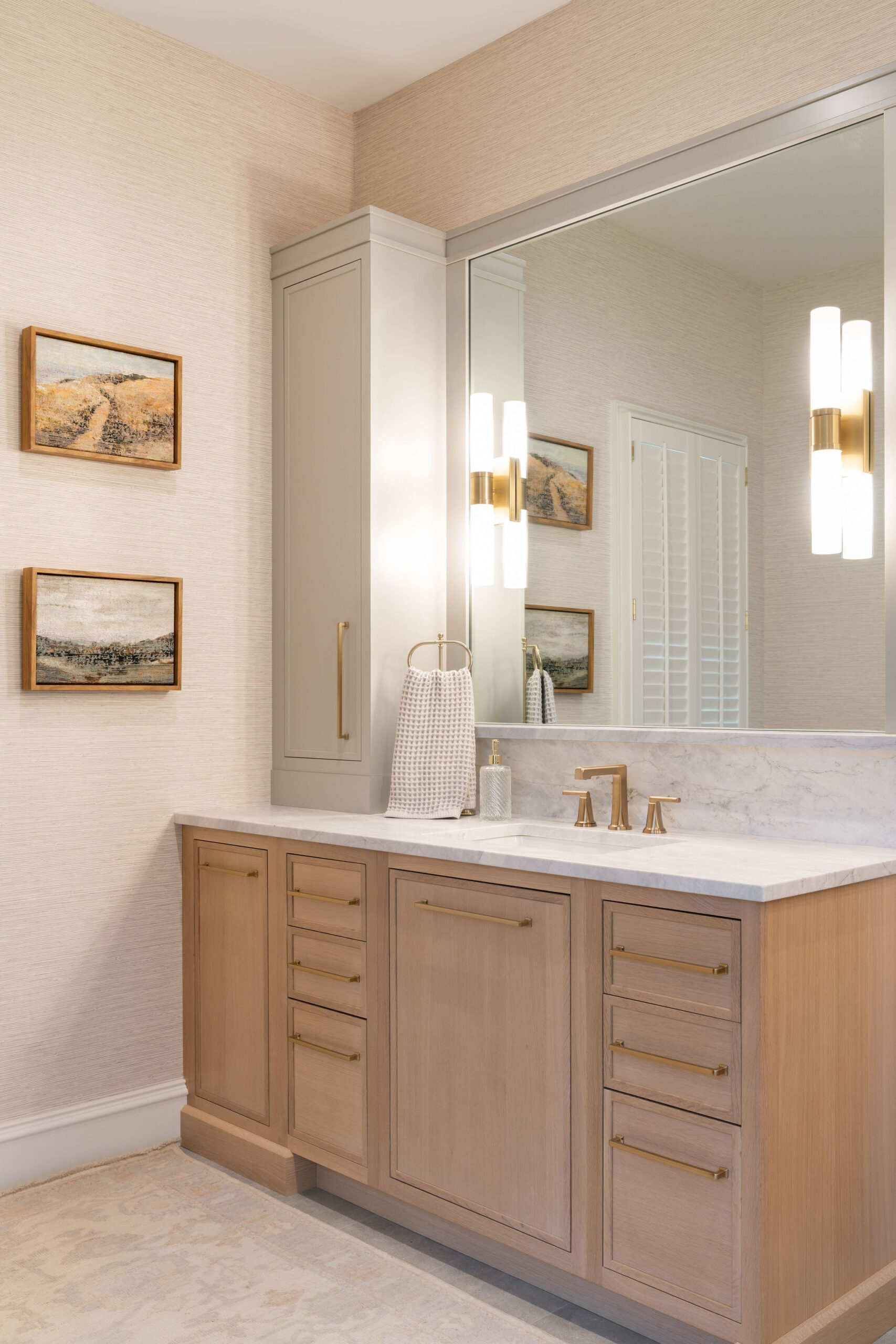 In the Primary Suite, the jetted tub was removed in favor of a sit down vanity. Both sink vanities were upgraded to a light wood stain with quartzite natural stone tops, stone floor and wall tile, and accent marble behind the golden bronze plumbing fixtures. Soft blues and greens in the tiles, rugs and fabrics of this suite bring a relaxing and meditative atmosphere for getting away from it all at the end of the day. Existing artwork and a chandelier were repurposed in the new scheme.