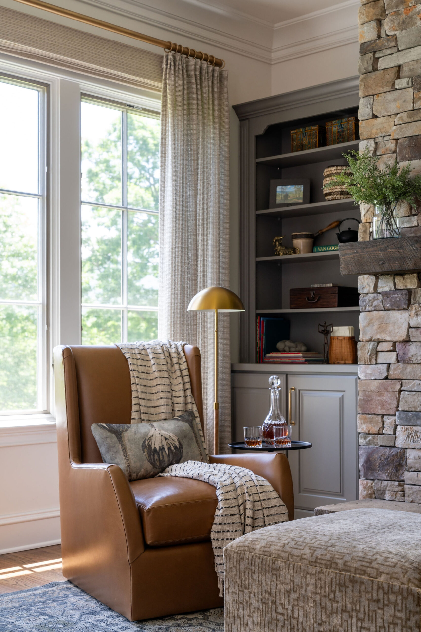 For the Sitting Room off the Kitchen, the existing fireplace surround was maintained while the built-ins were painted a deep green, pulling the colors from outdoors in. New casement style window treatments frame the views and draw the eye upward. The locally made leather seating also swivels toward the view, and is a comfortable spot for reading by the fire or enjoying a morning coffee. The adjacent Dining Room features a custom crafted dining table and comfortable upholstered chairs.
