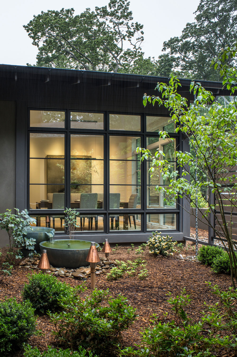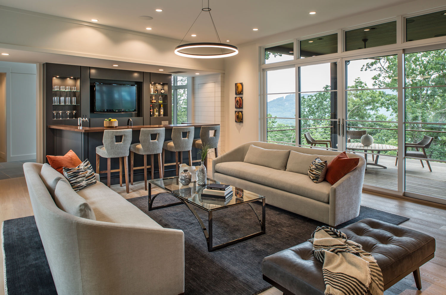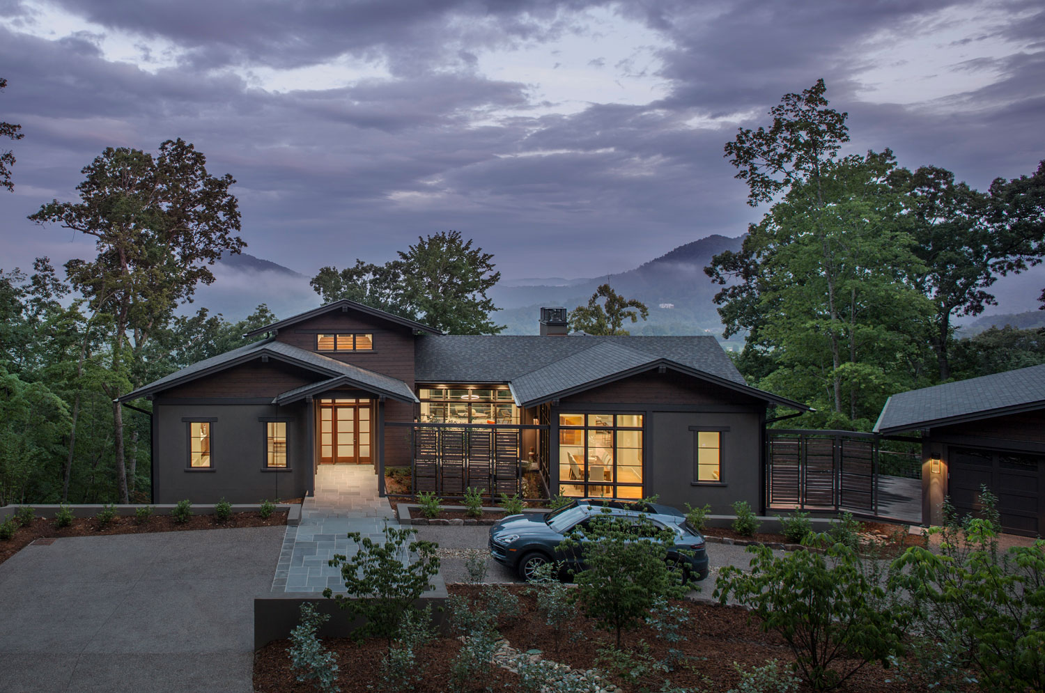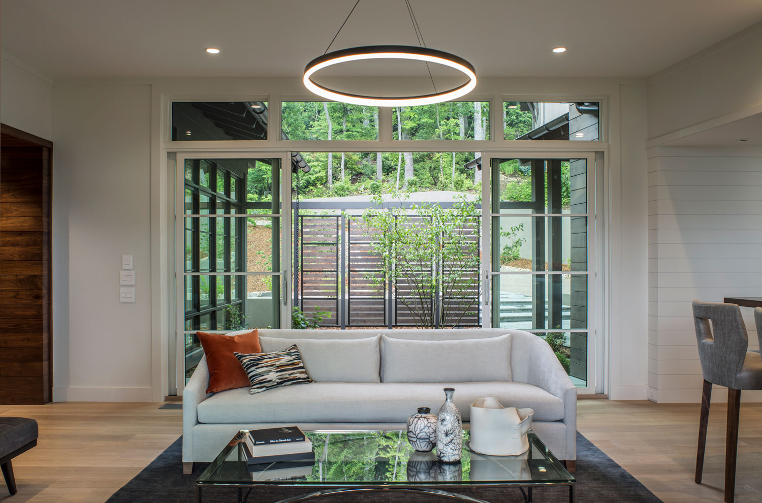 We are often part of a design/build team, and that was the case for this new construction project located in The Cliffs at Walnut Cove in Arden, NC. We had worked with both Samsel Architects and Glennwood Custom Builders on numerous past projects, and were happy to collaborate with them on another high end custom home project. The homeowners would be living out of state during the process, so they looked to their team to coordinate and collaborate on their behalf throughout construction. This modern home is designed around a front entry courtyard that’s accessible through sliding doors in the Living Room, and can also be seen from the Dining Room. During the final furniture and art installation, there was a rain storm that inspired the name of this project as the “Rain Garden Residence”.
