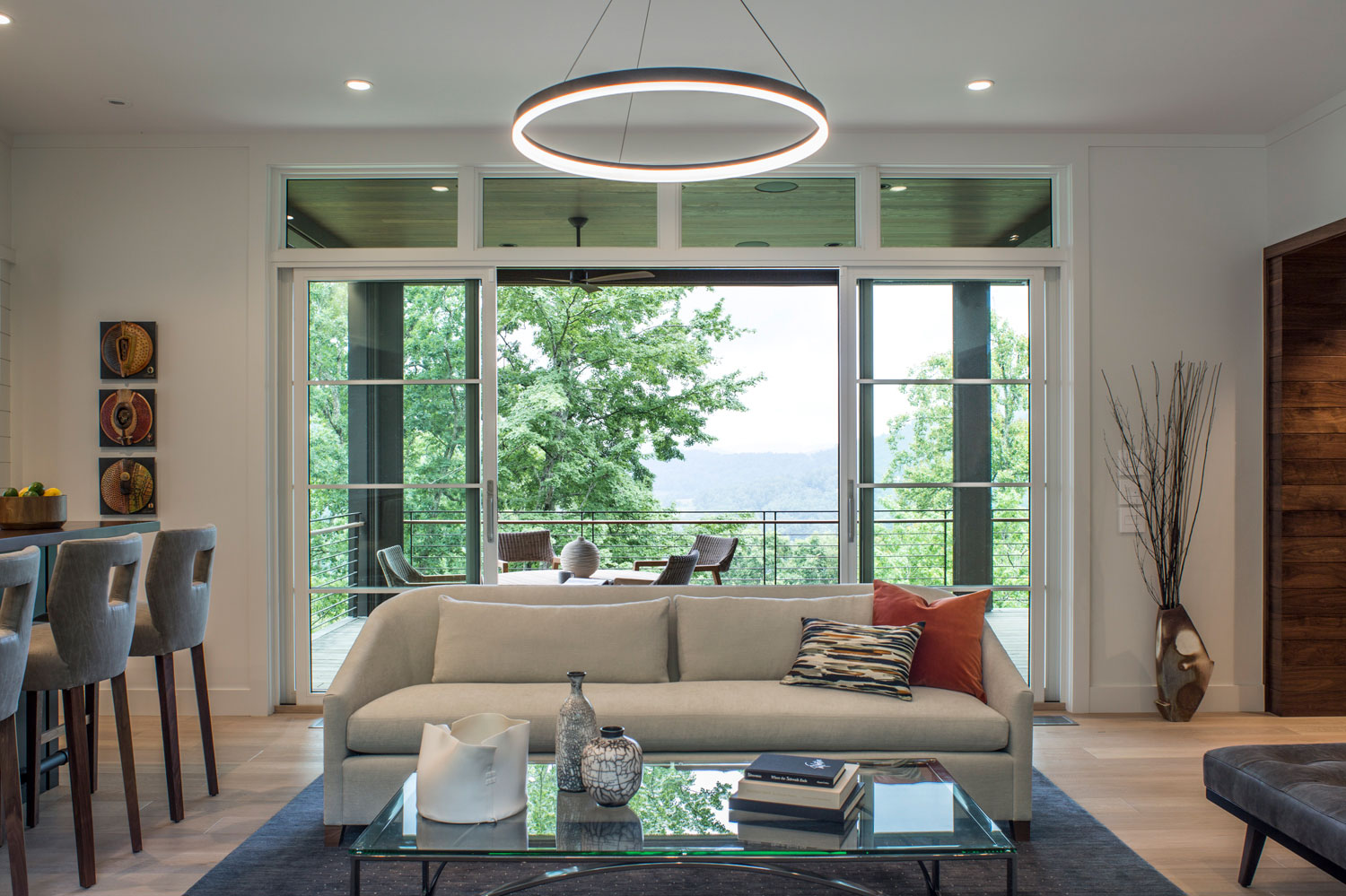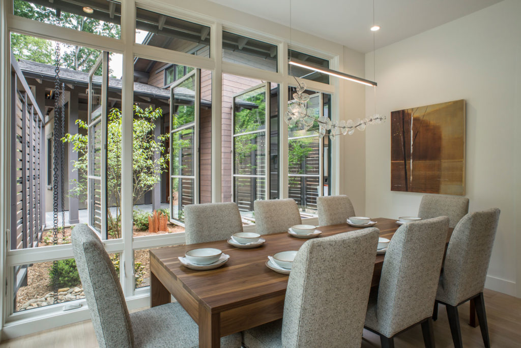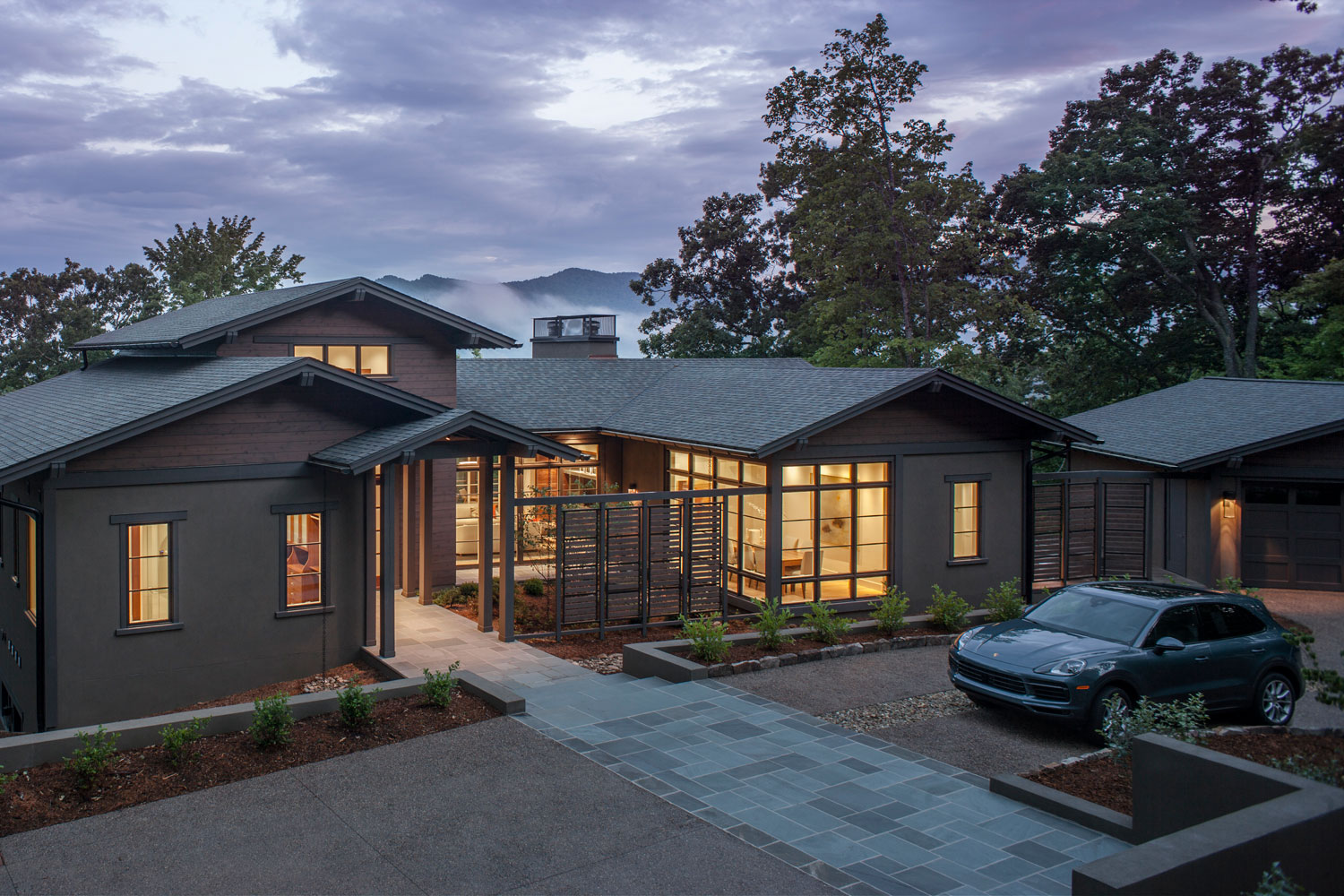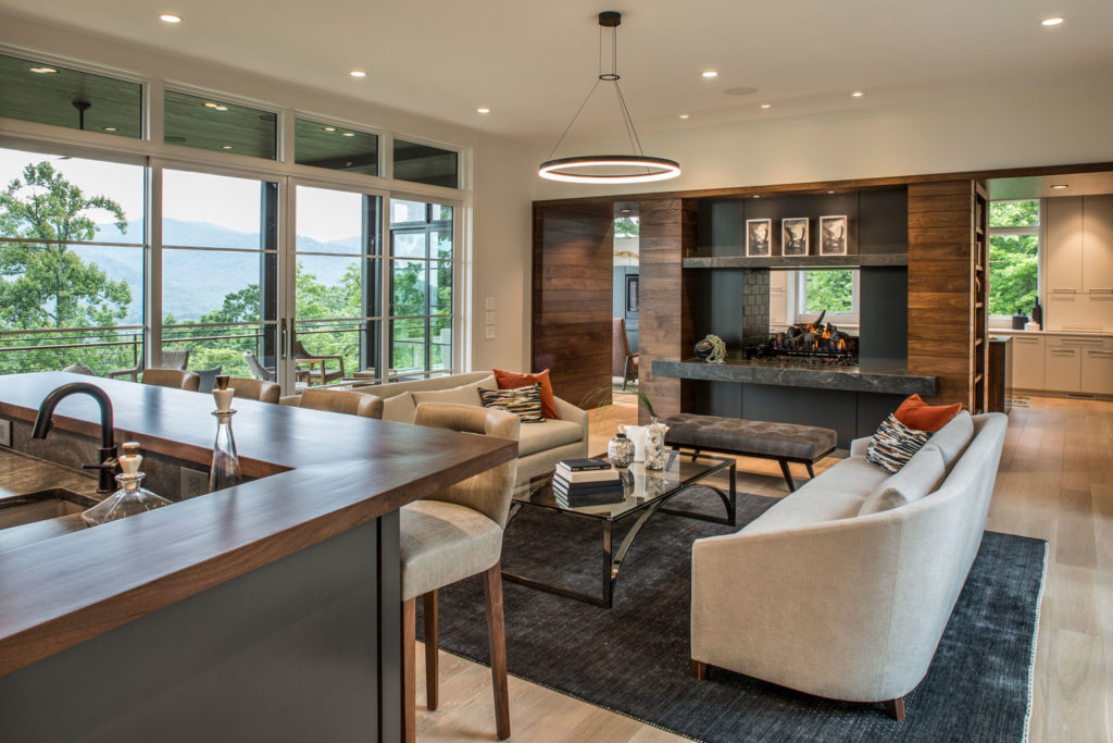 We are often part of a design/build team, and that was the case for this new construction project located in The Cliffs at Walnut Cove in Arden, NC. We had worked with both Samsel Architects and Glennwood Custom Builders on numerous past projects, and were happy to collaborate with them on another high end custom home project. The homeowners would be living out of state during the process, so they looked to their team to coordinate and collaborate on their behalf throughout construction. This modern home is designed around a front entry courtyard that’s accessible through sliding doors in the Living Room, and can also be seen from the Dining Room. During the final furniture and art installation, there was a rain storm that inspired the name of this project as the “Rain Garden Residence”.
