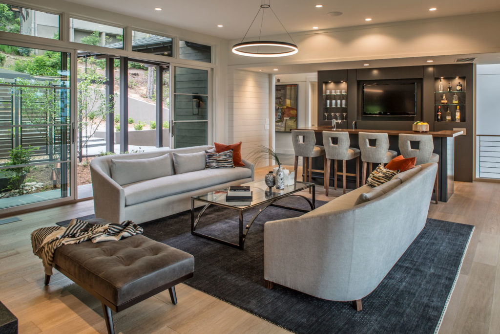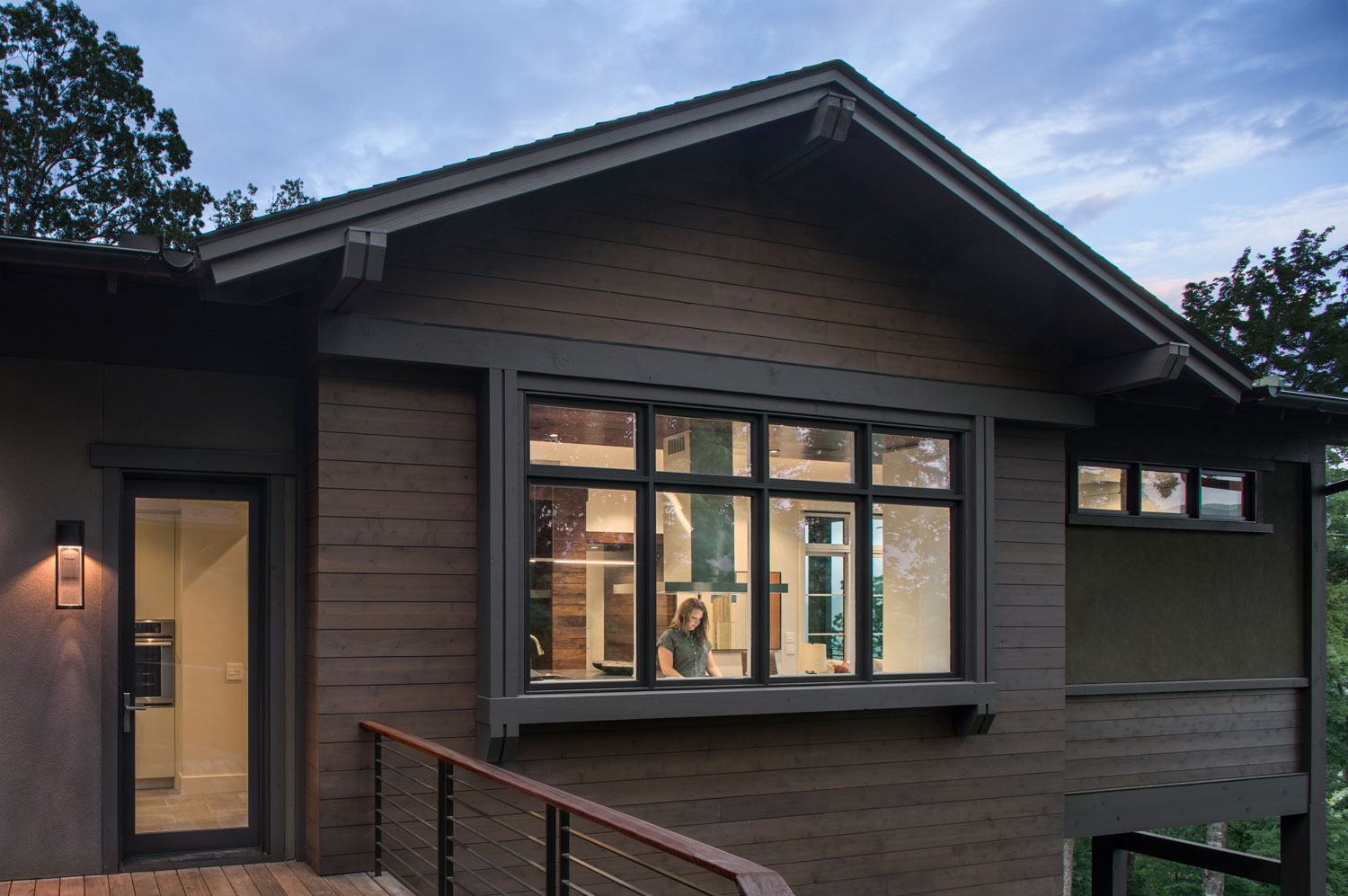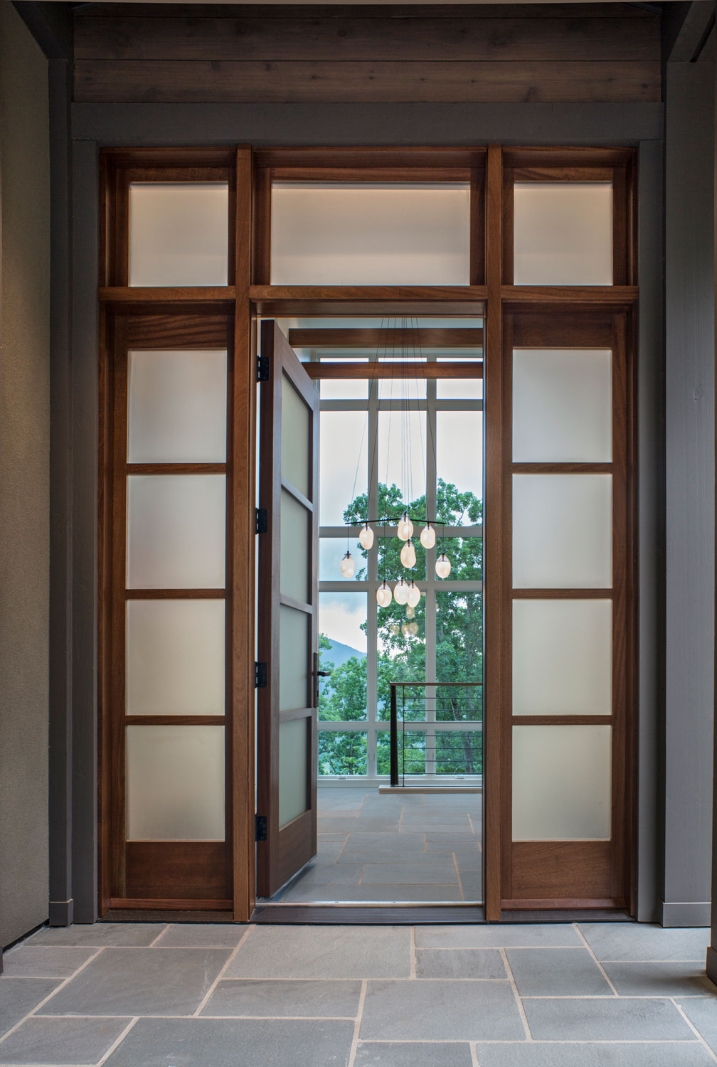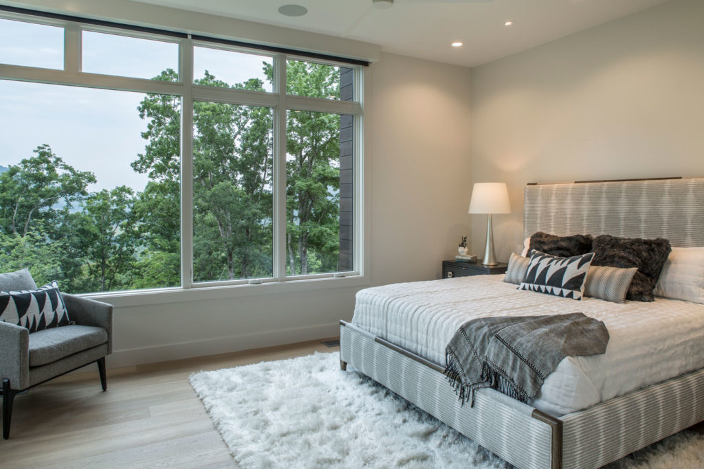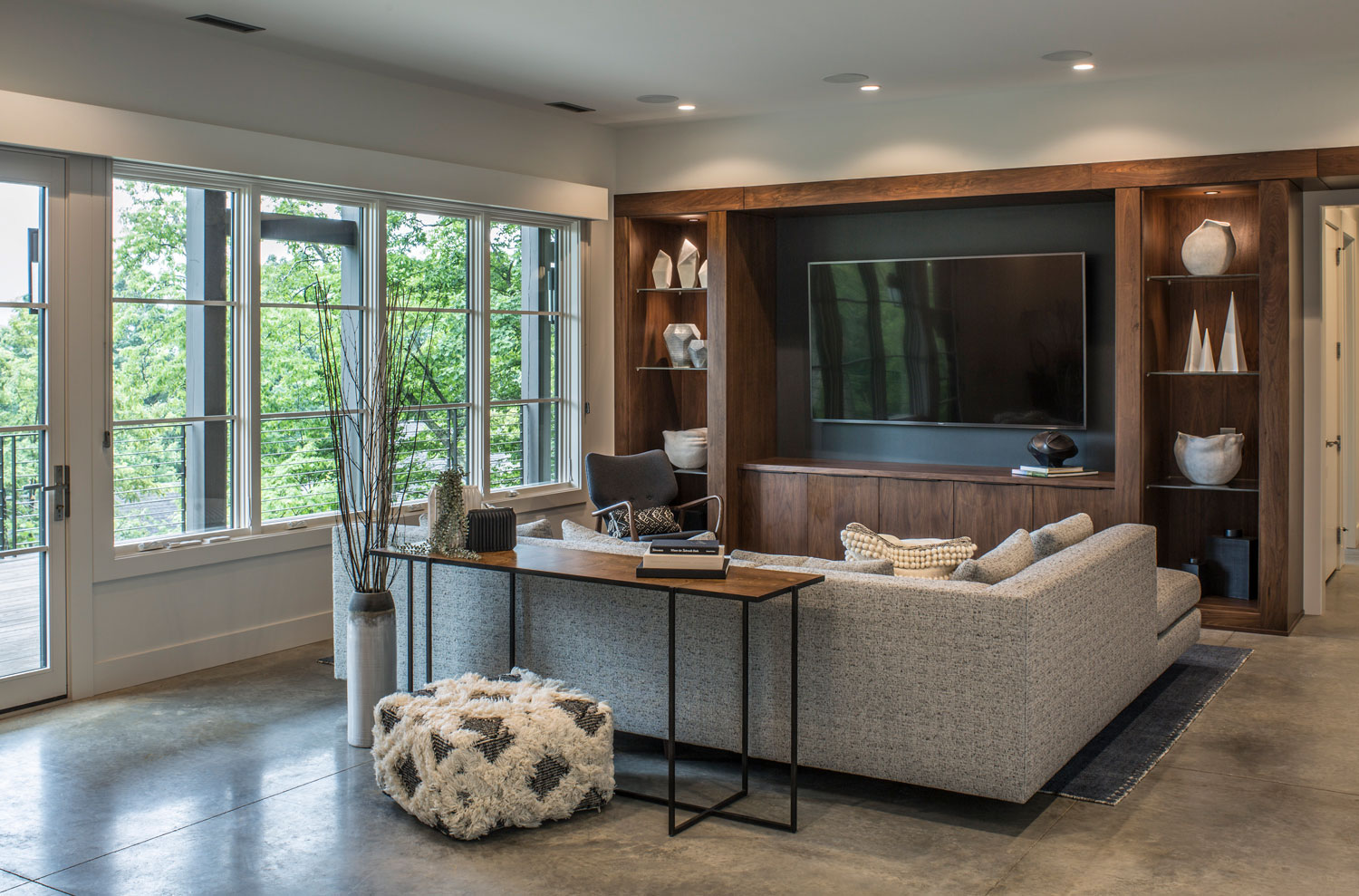 We are often part of a design/build team, and that was the case for this new construction project located in The Cliffs at Walnut Cove in Arden, NC. We had worked with both Samsel Architects and Glennwood Custom Builders on numerous past projects, and were happy to collaborate with them on another high end custom home project. The homeowners would be living out of state during the process, so they looked to their team to coordinate and collaborate on their behalf throughout construction. This modern home is designed around a front entry courtyard that’s accessible through sliding doors in the Living Room, and can also be seen from the Dining Room. During the final furniture and art installation, there was a rain storm that inspired the name of this project as the “Rain Garden Residence”.