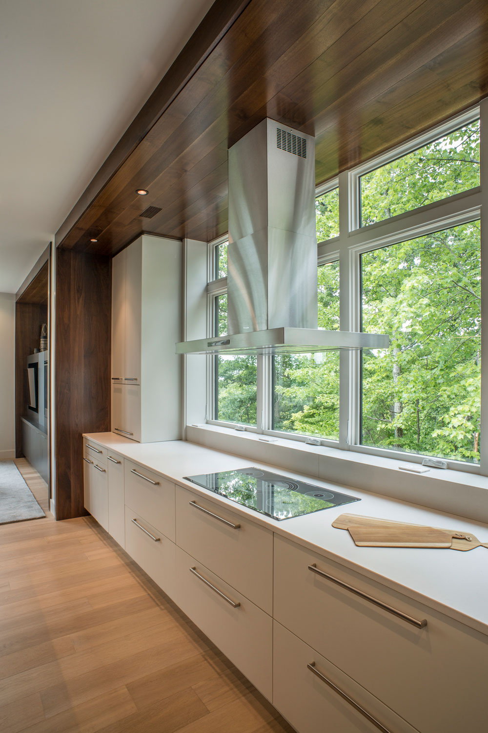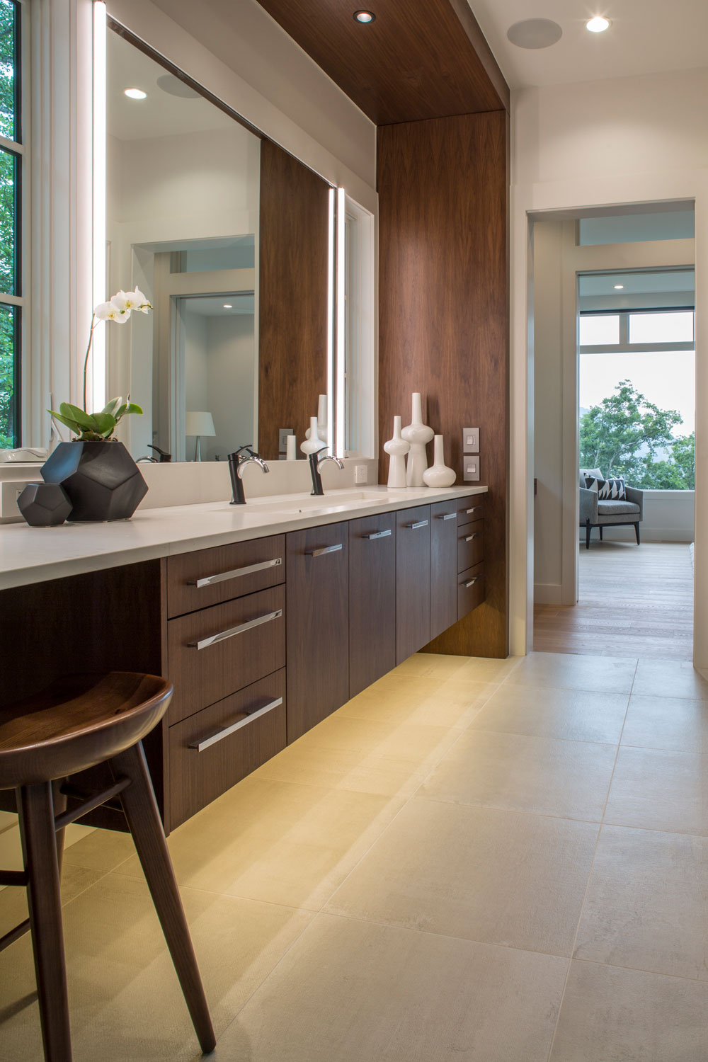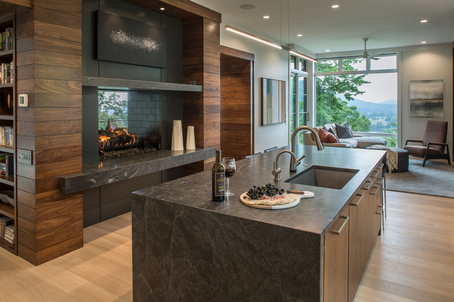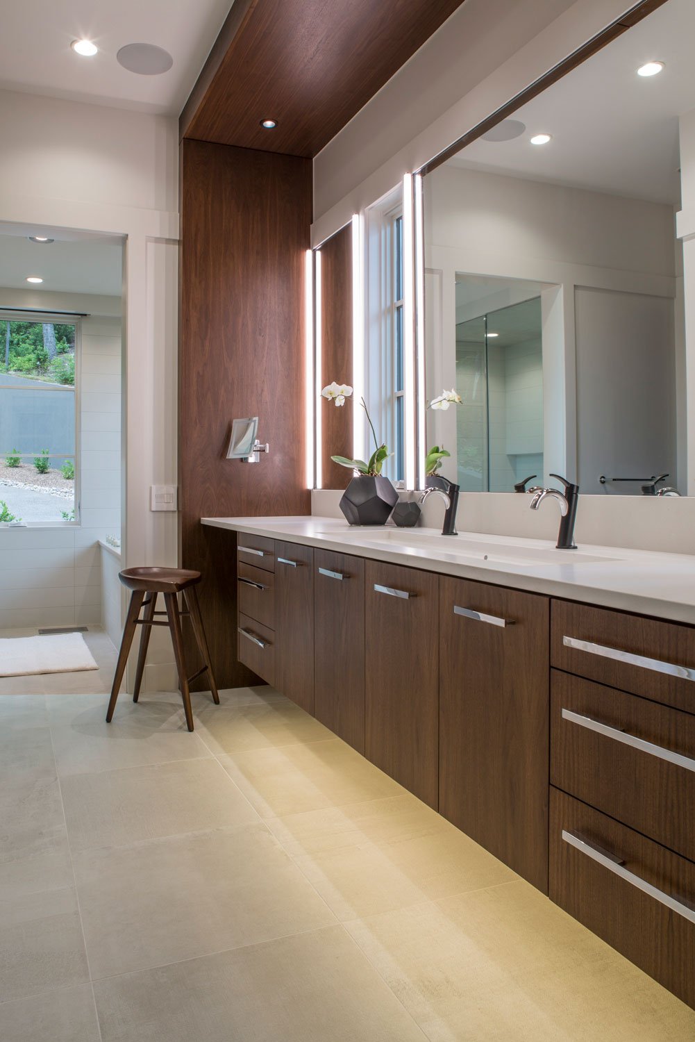The architects envisioned this home as a modern take on prairie style architecture with a roofline that hugs the landscape. The mountain views of Asheville and beyond are visible just opposite the garden, on the other side of the Living Room. With such long range views providing incredible color and texture, our design team kept fabrics and finishes intentionally neutral in this room. Our clients love to entertain and make drinks for their friends, so the wet bar is also a focal point of this space, balanced on the other end of the room by a walnut and steel clad gas fireplace. We collaborated with the architects on all of the finishes here, so as not to detract from the views of the garden or the landscape. Ultimately, we settled on a “walnut and white” palette for paint and wood finishes. Accents of steel and stone are included for contrast and durability as well. Those finishes, in addition to the European white oak floors, are repeated throughout the home for continuity from room to room.