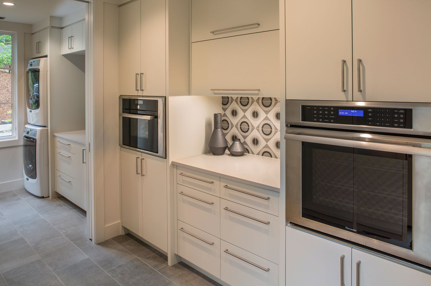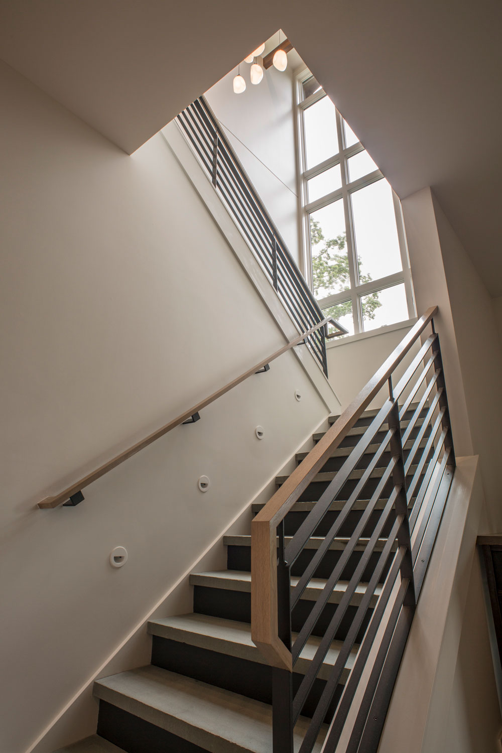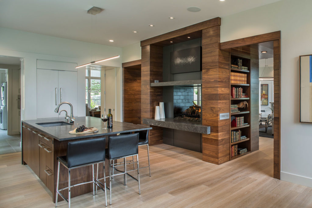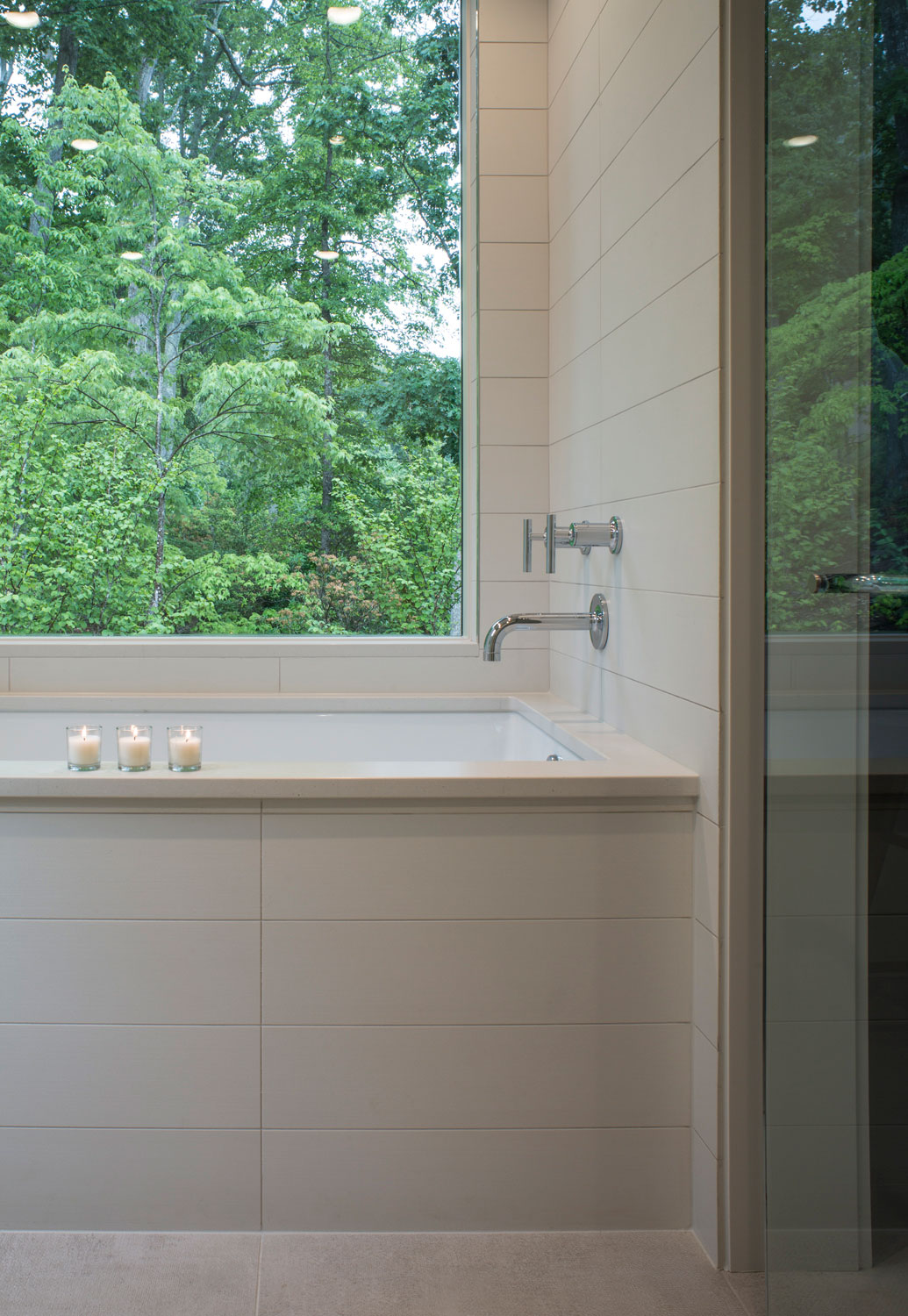 The architects envisioned this home as a modern take on prairie style architecture with a roofline that hugs the landscape. The mountain views of Asheville and beyond are visible just opposite the garden, on the other side of the Living Room. With such long range views providing incredible color and texture, our design team kept fabrics and finishes intentionally neutral in this room. Our clients love to entertain and make drinks for their friends, so the wet bar is also a focal point of this space, balanced on the other end of the room by a walnut and steel clad gas fireplace. We collaborated with the architects on all of the finishes here, so as not to detract from the views of the garden or the landscape. Ultimately, we settled on a “walnut and white” palette for paint and wood finishes. Accents of steel and stone are included for contrast and durability as well. Those finishes, in addition to the European white oak floors, are repeated throughout the home for continuity from room to room.