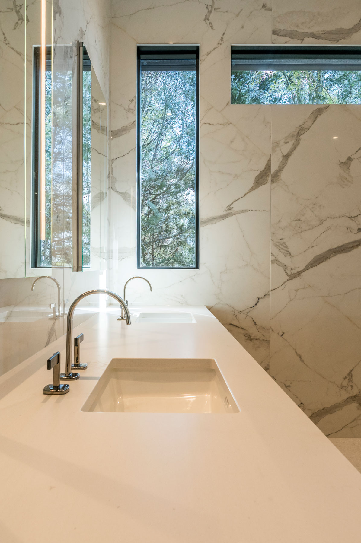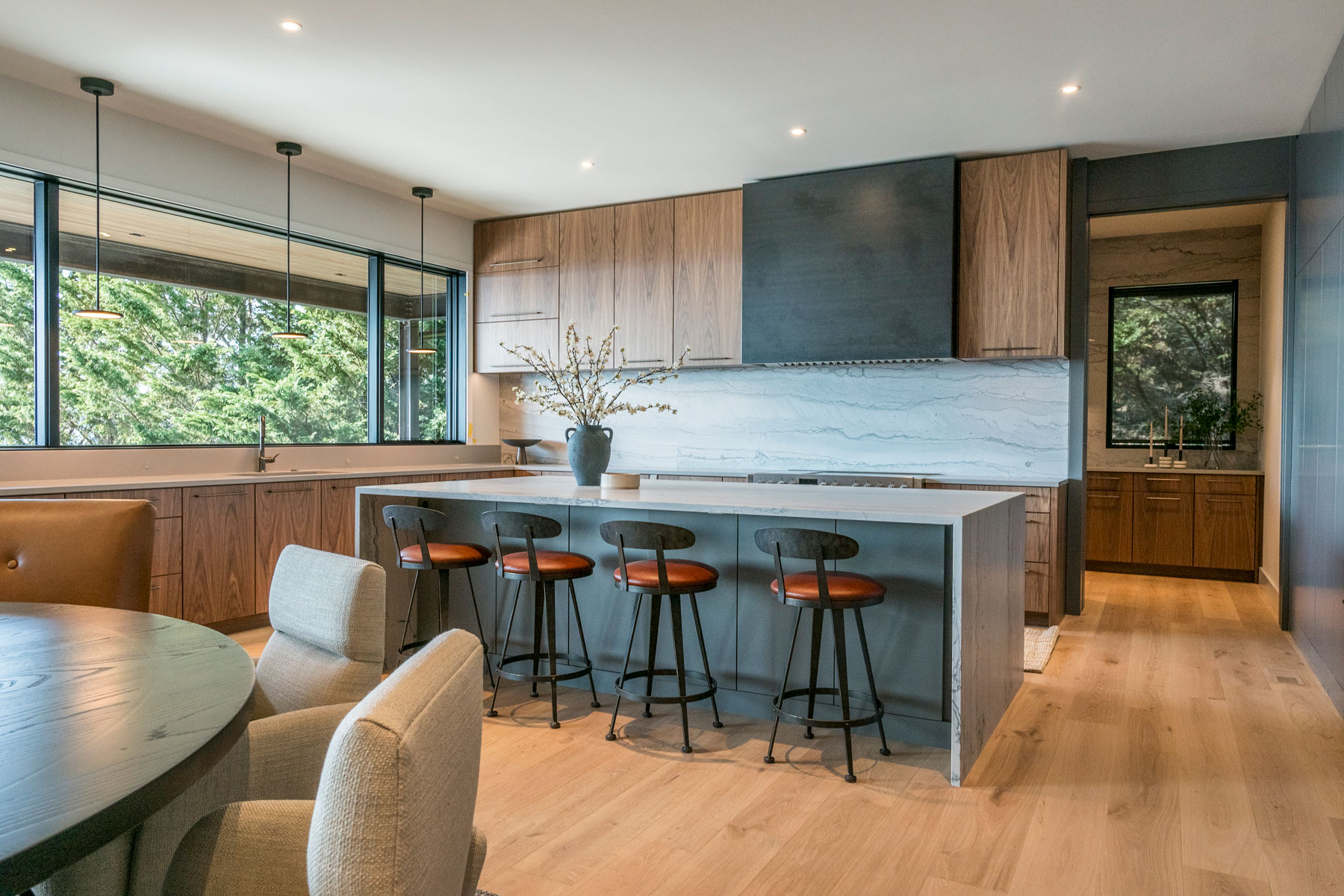 The Kitchen floor space expanded outward, and a new picture window was placed over the sink area. New walnut cabinetry with slab doors is the star of the Kitchen, while a custom steel hood and leathered quartzite island top and slab backsplash add natural beauty and durability. Behind the Kitchen is a Butler’s Pantry featuring a coffee station, pantry storage, a sink and a slab splash to encase the new picture window.
