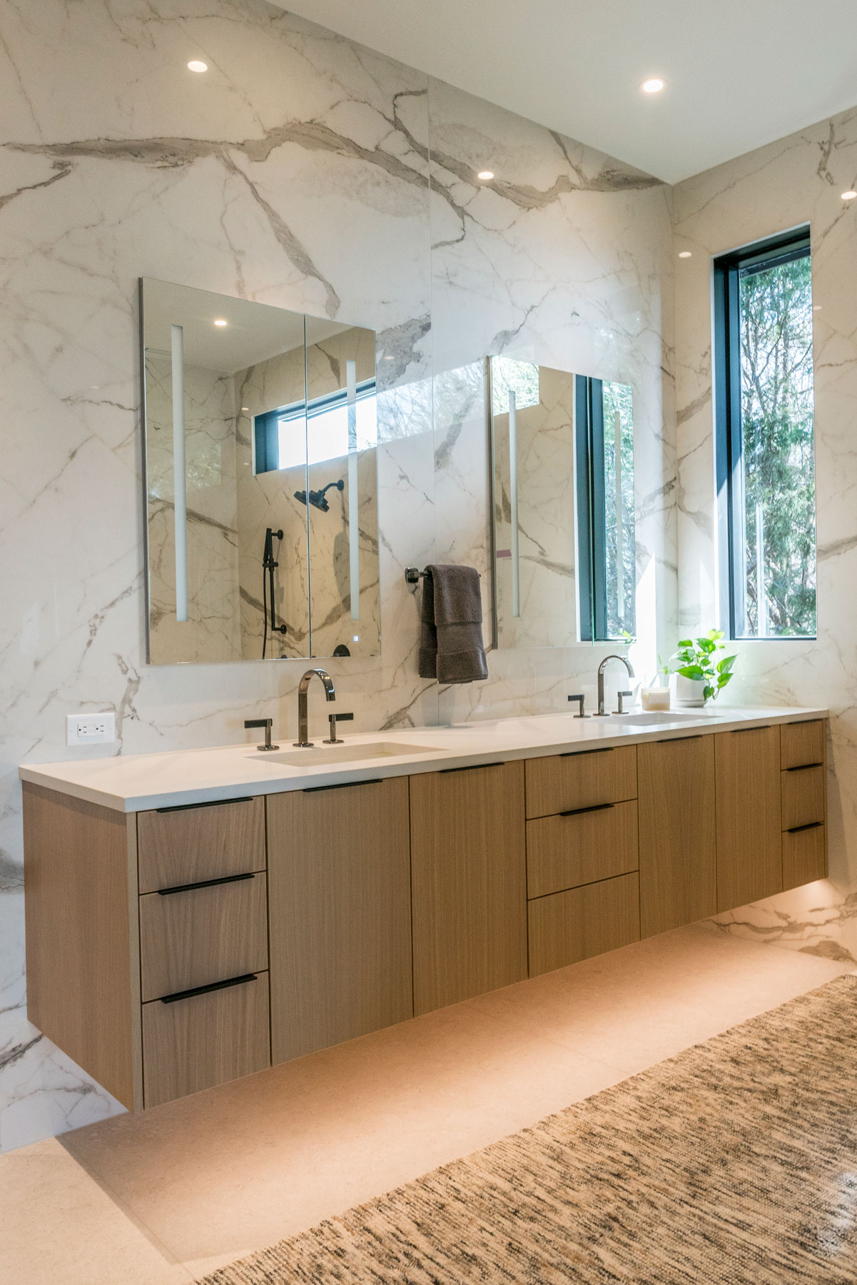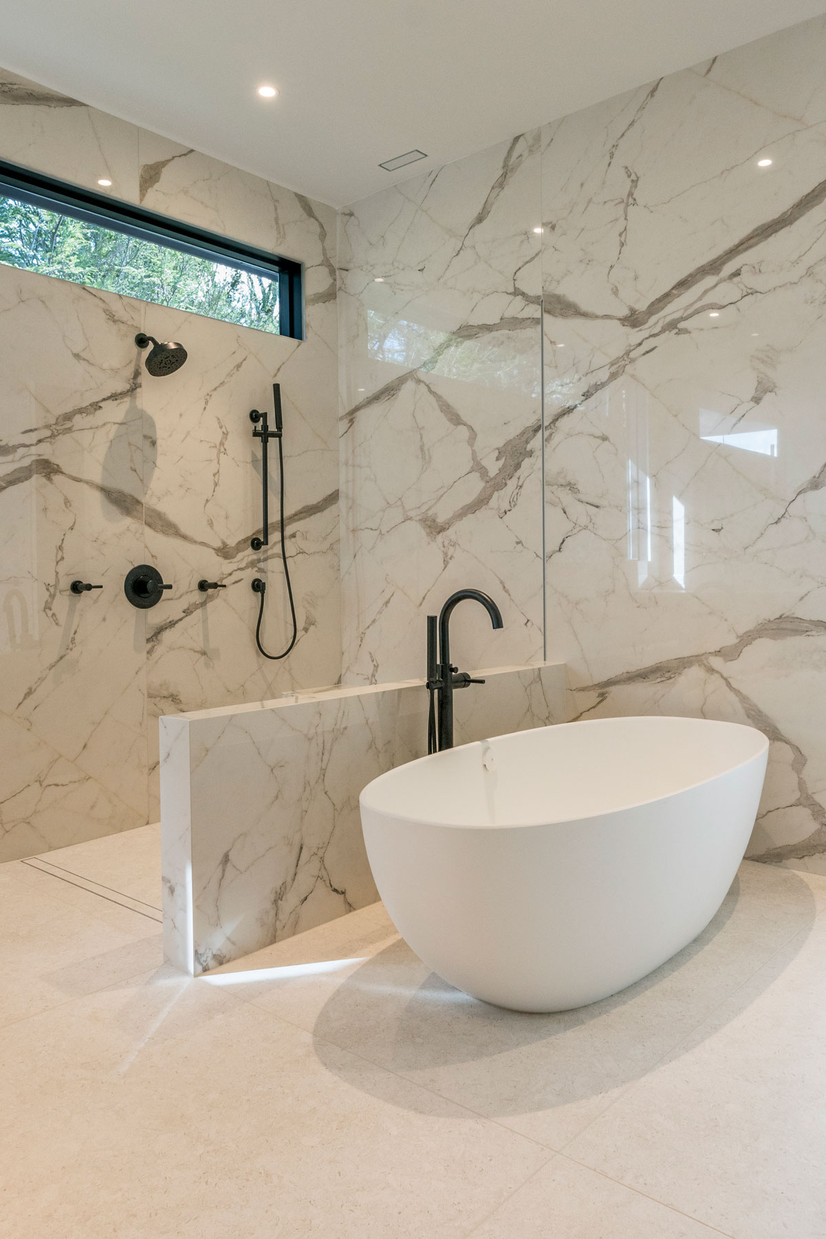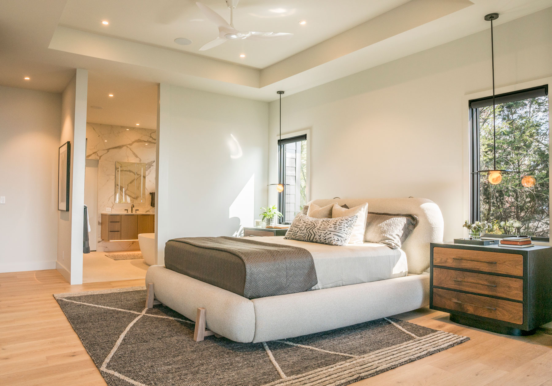 In the Master Suite, a sitting area was added, as were new windows at the bed wall, and built-ins across from the bed. Regionally made furniture graces these spaces as well. Our clients desired a bathroom tile that would be easy to maintain. Our designers specified a large format porcelain panel product, to minimize seams and grout joints in this room. The patterns mimic marble, without the maintenance a natural stone would have required. This room also features a rift cut oak floating vanity, large curbless walk in shower and a freestanding tub.