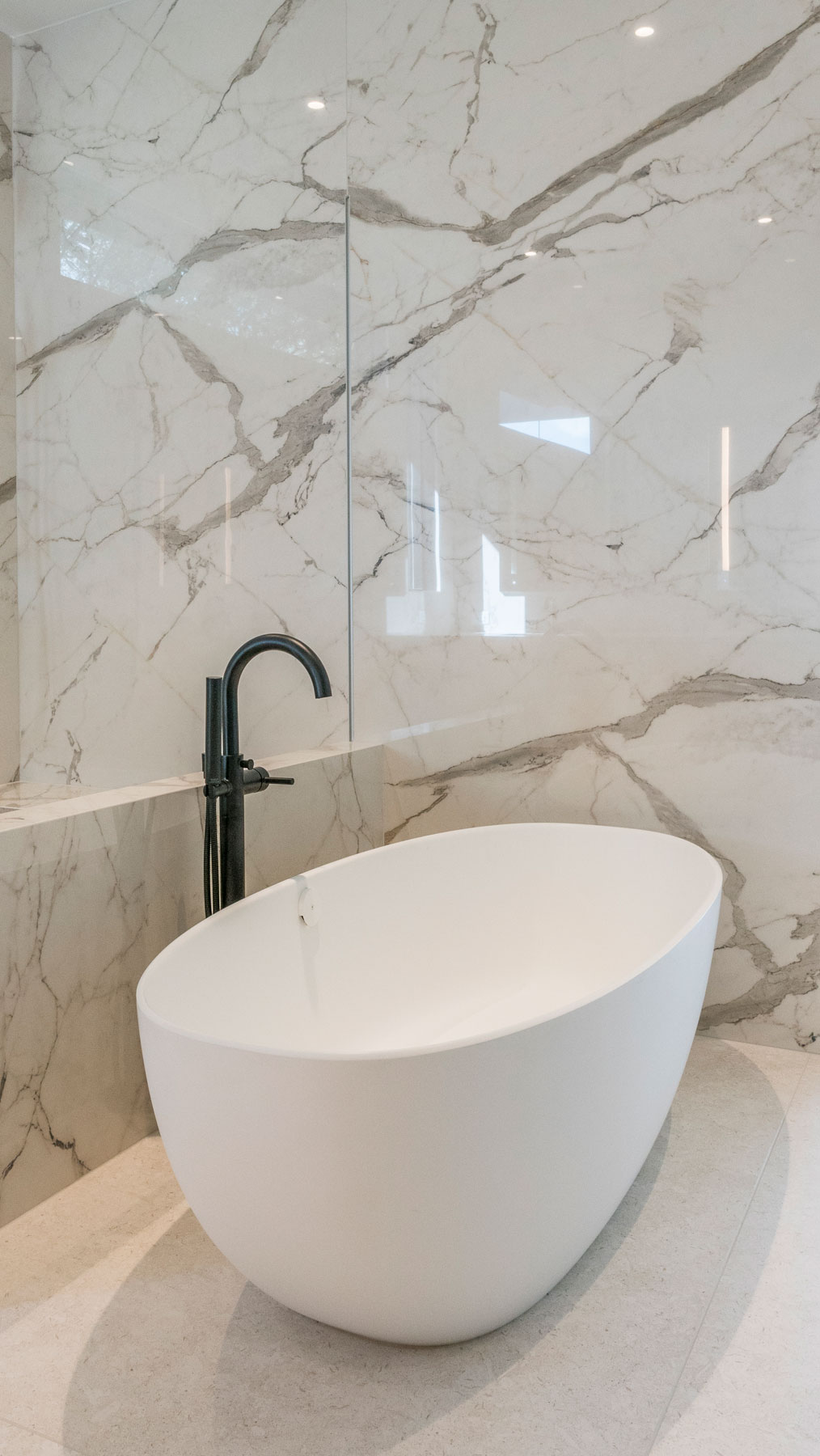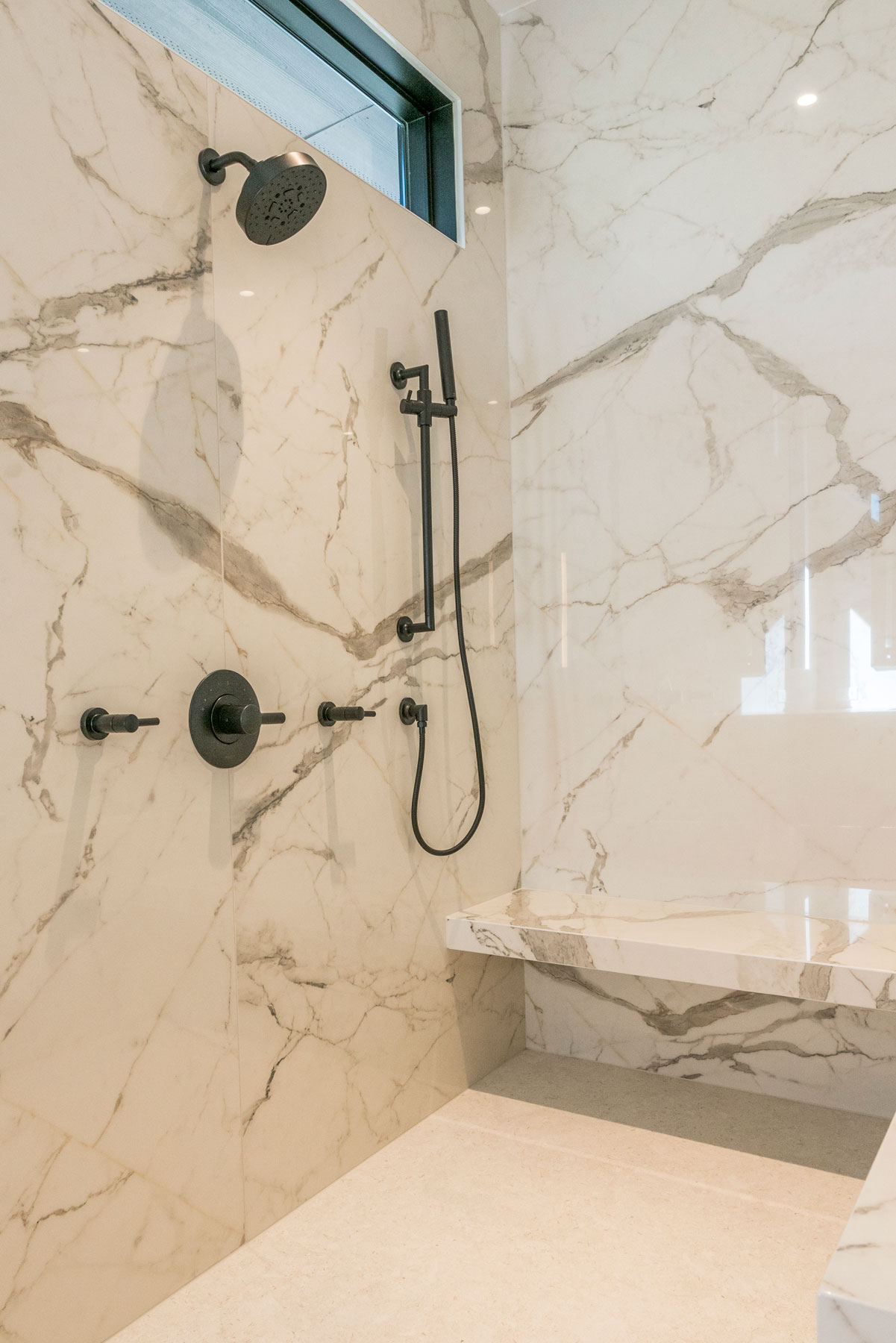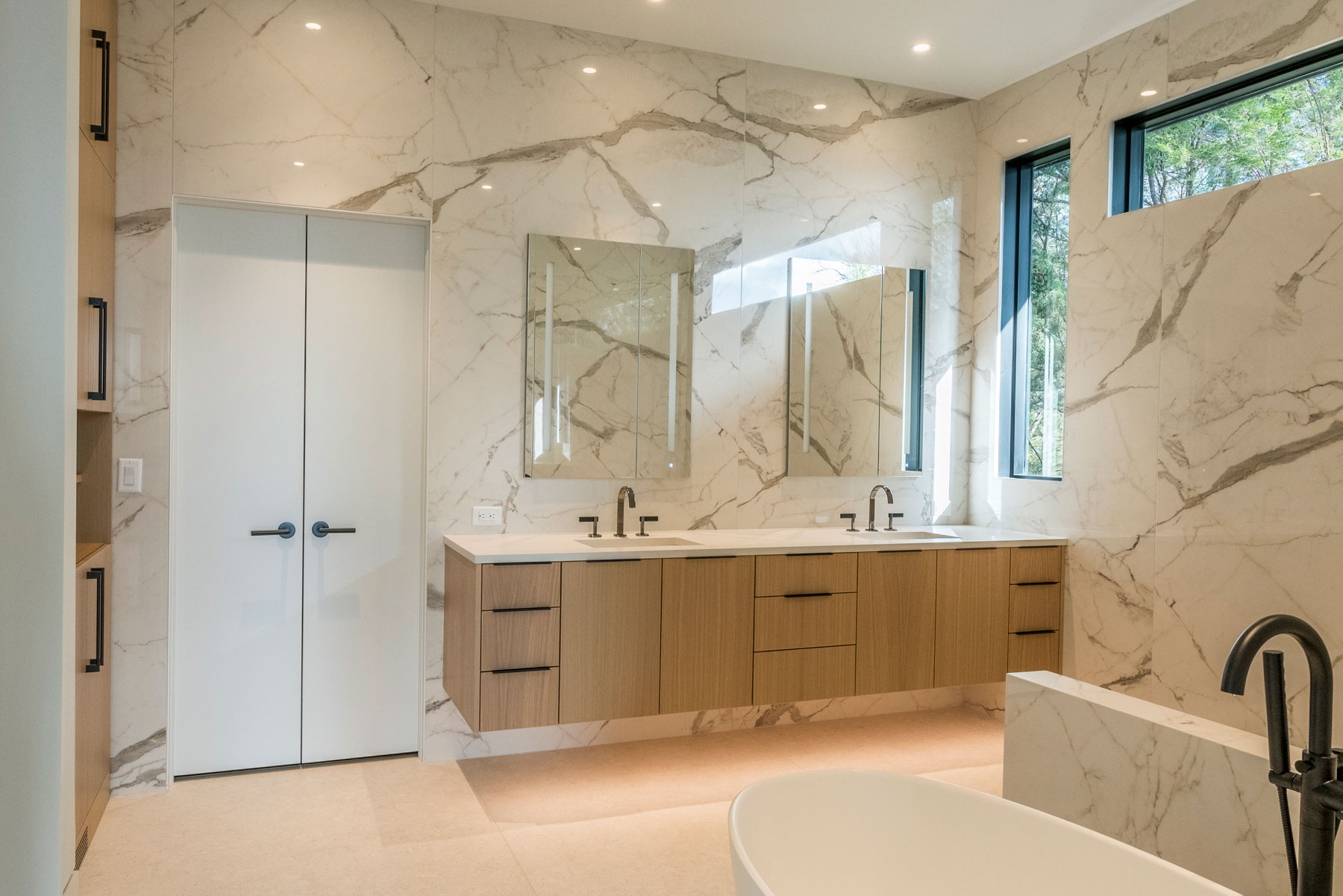 In the Master Suite, a sitting area was added, as were new windows at the bed wall, and built-ins across from the bed. Regionally made furniture graces these spaces as well. Our clients desired a bathroom tile that would be easy to maintain. Our designers specified a large format porcelain panel product, to minimize seams and grout joints in this room. The patterns mimic marble, without the maintenance a natural stone would have required. This room also features a rift cut oak floating vanity, large curbless walk in shower and a freestanding tub.
