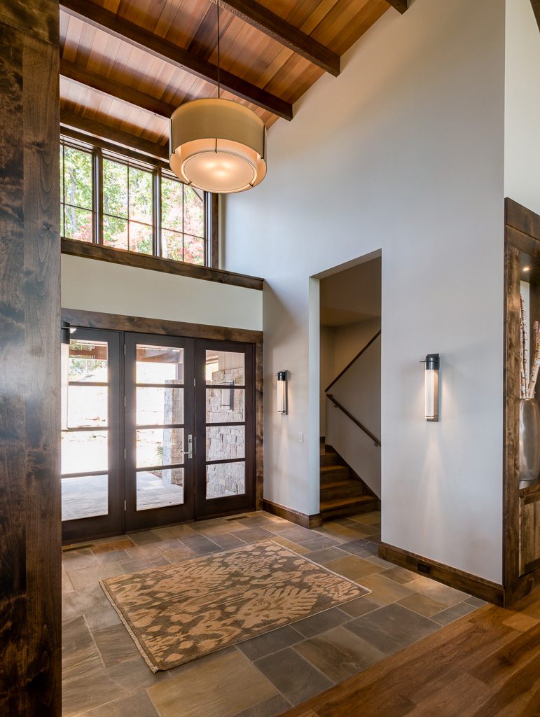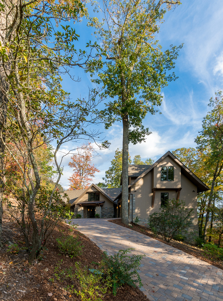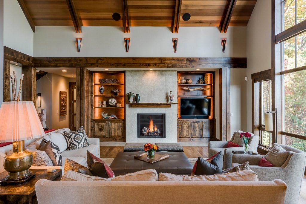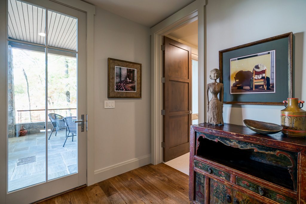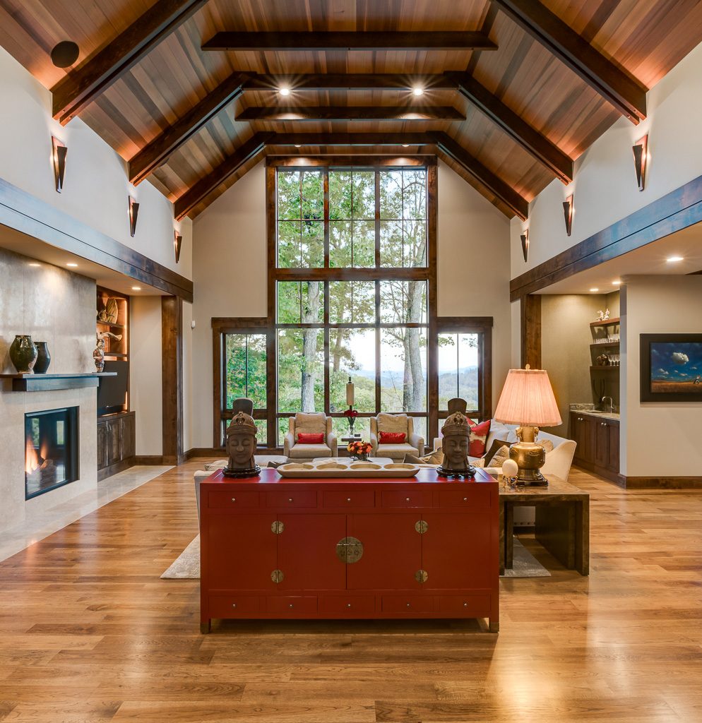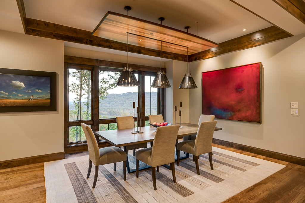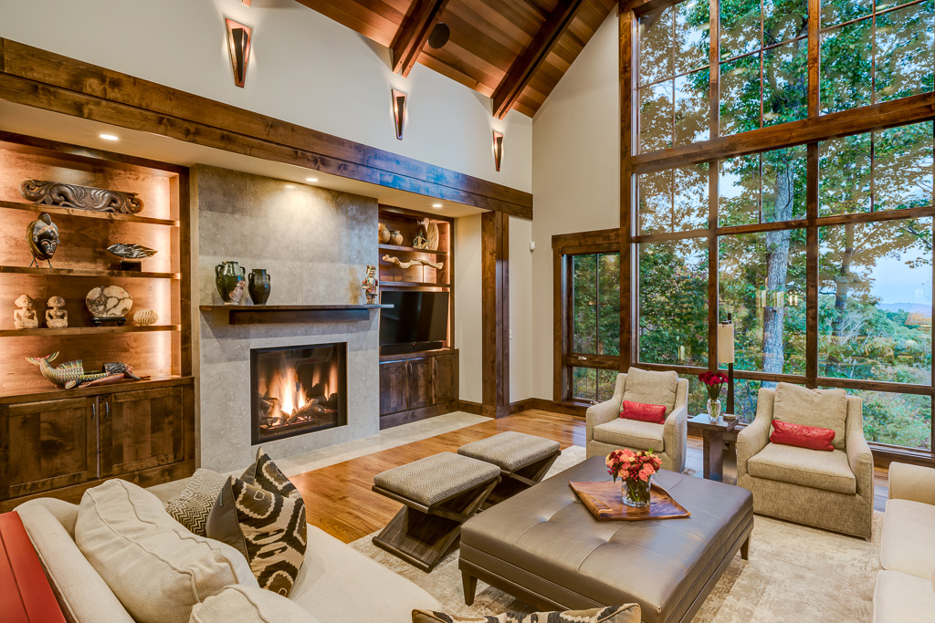 This is a custom mountain home located in The Cliffs at Walnut Cove in the Asheville, NC area. We worked with the homeowners, architect, builder & subcontractors during the planning stages and throughout construction. We collaborated on all of the finishes and fixtures, as well as furniture & decor selections. Custom details were designed throughout the home, including the ceilings, fireplace surrounds, cabinetry details, lighting fixtures & features, and tile & stone accents. The home owner’s existing furnishings, artwork & decor were placed throughout the home, and we added in new items from our North Carolina based manufacturers, vendors, artists & artisans. Neutral backgrounds are incorporated with a variety of warm wood tones, and pops of accent color can be changed out over time. The spectacular mountain views take center stage in each room, and can be seen through the glass of the custom front entry doors. Our clients have now relocated from Texas to their new home, and are enjoying their Asheville home and lifestyle!