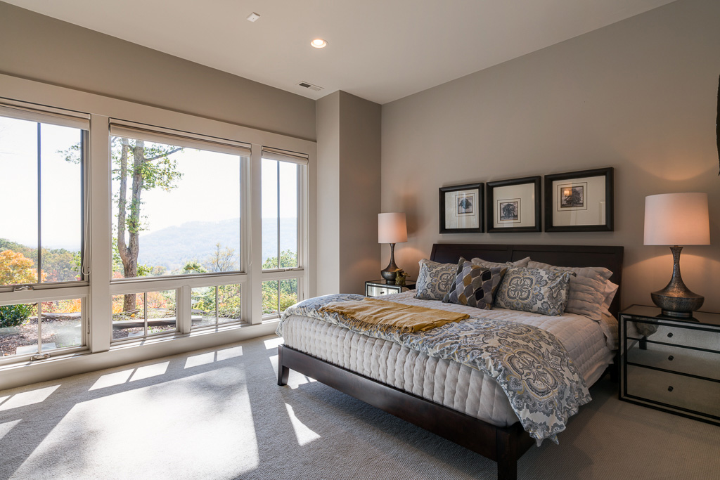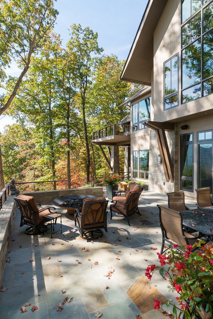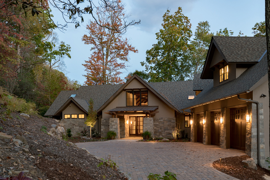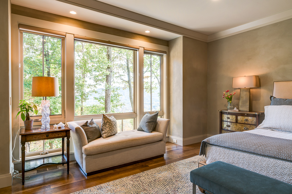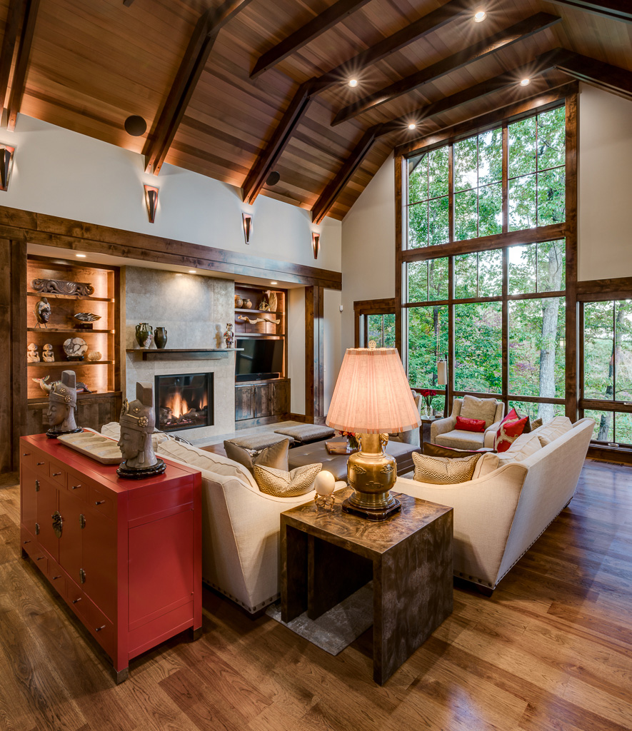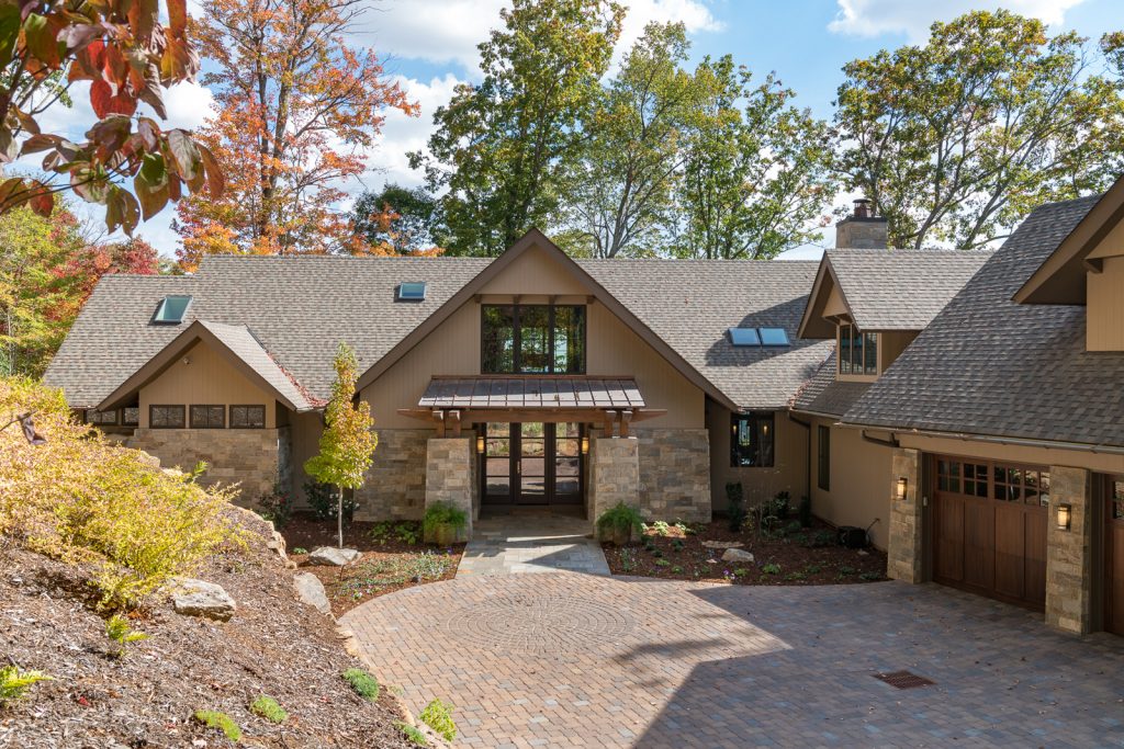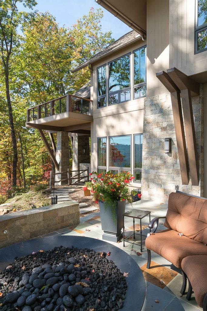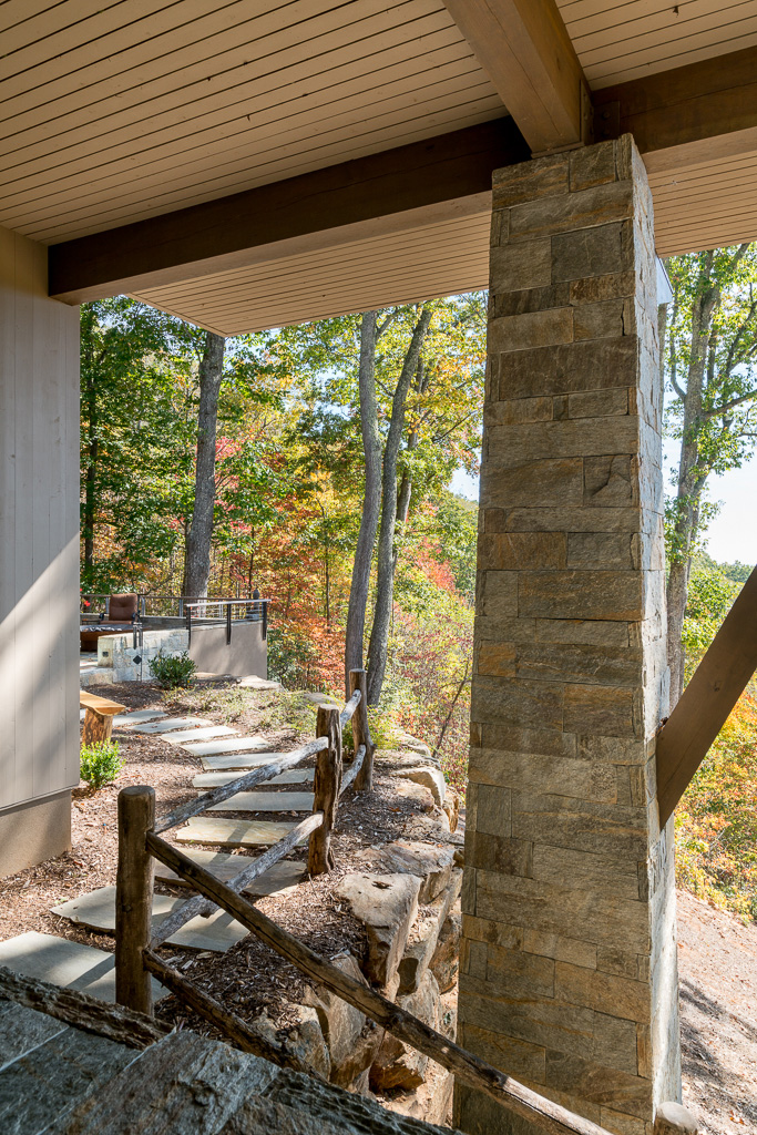 This is a custom mountain home located in The Cliffs at Walnut Cove in the Asheville, NC area. We worked with the homeowners, architect, builder & subcontractors during the planning stages and throughout construction. We collaborated on all of the finishes and fixtures, as well as furniture & decor selections. Custom details were designed throughout the home, including the ceilings, fireplace surrounds, cabinetry details, lighting fixtures & features, and tile & stone accents. The home owner’s existing furnishings, artwork & decor were placed throughout the home, and we added in new items from our North Carolina based manufacturers, vendors, artists & artisans. Neutral backgrounds are incorporated with a variety of warm wood tones, and pops of accent color can be changed out over time. The spectacular mountain views take center stage in each room, and can be seen through the glass of the custom front entry doors. Our clients have now relocated from Texas to their new home, and are enjoying their Asheville home and lifestyle!