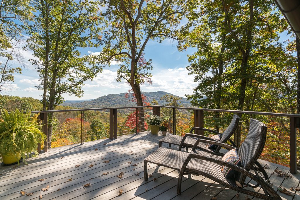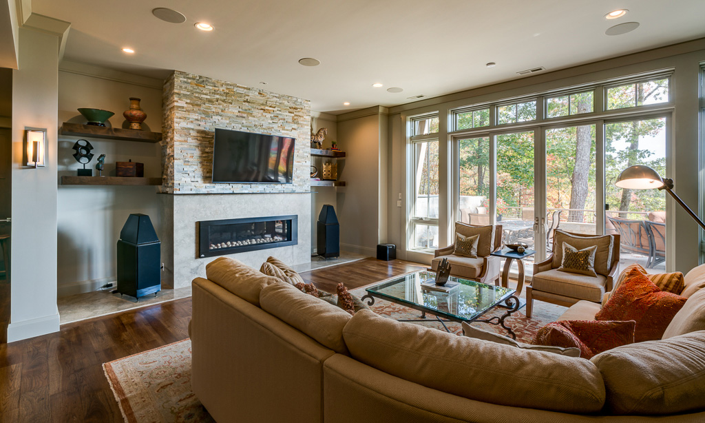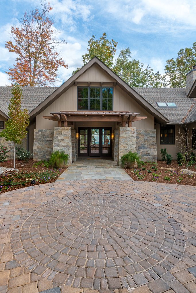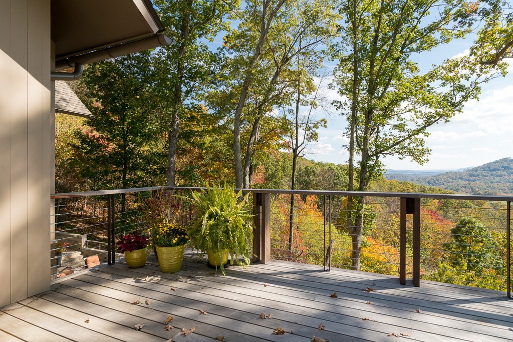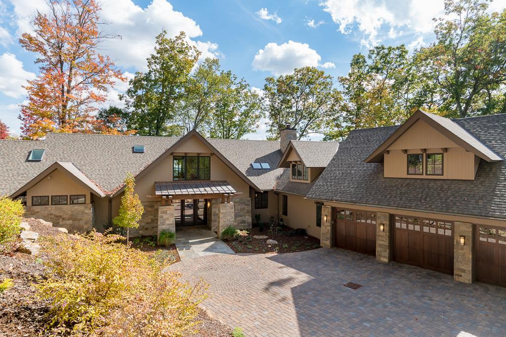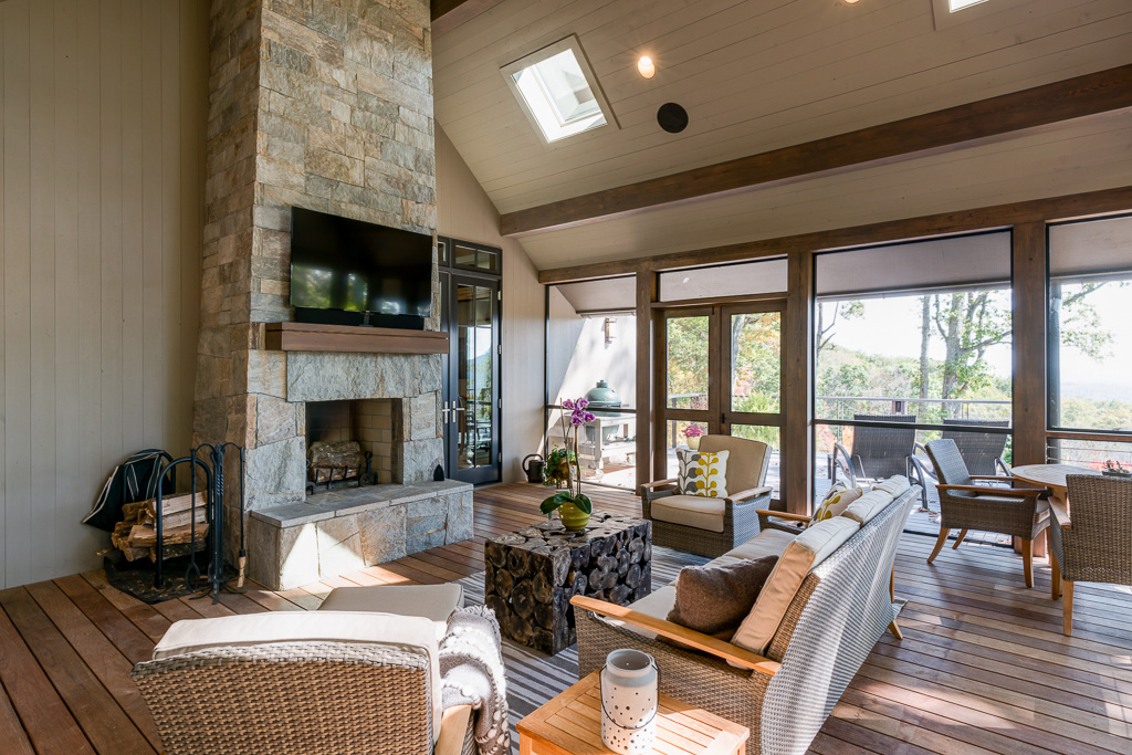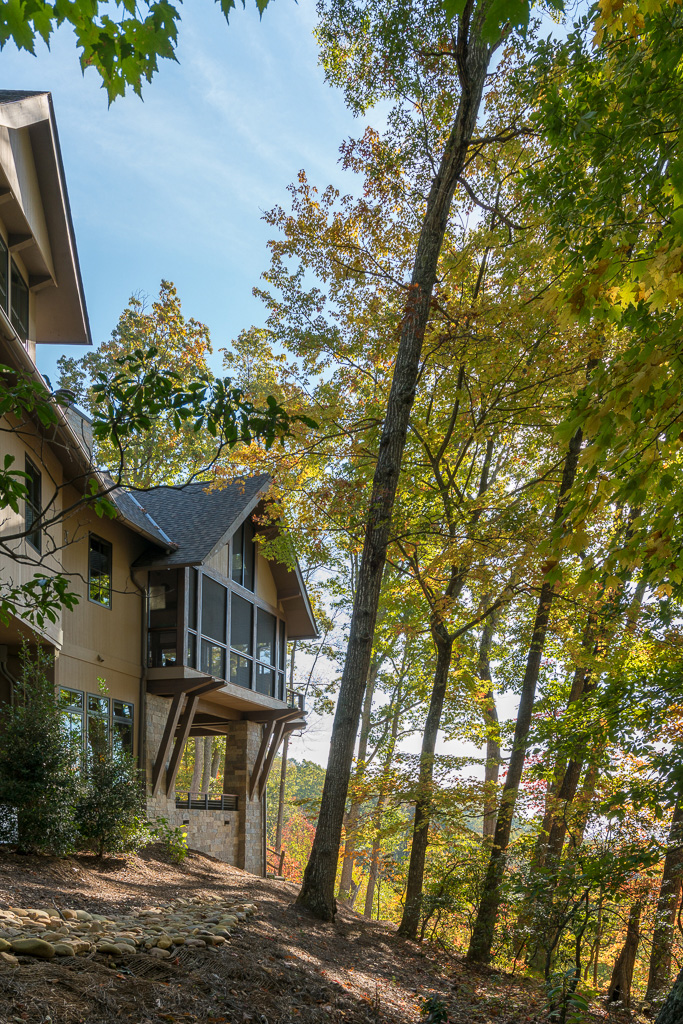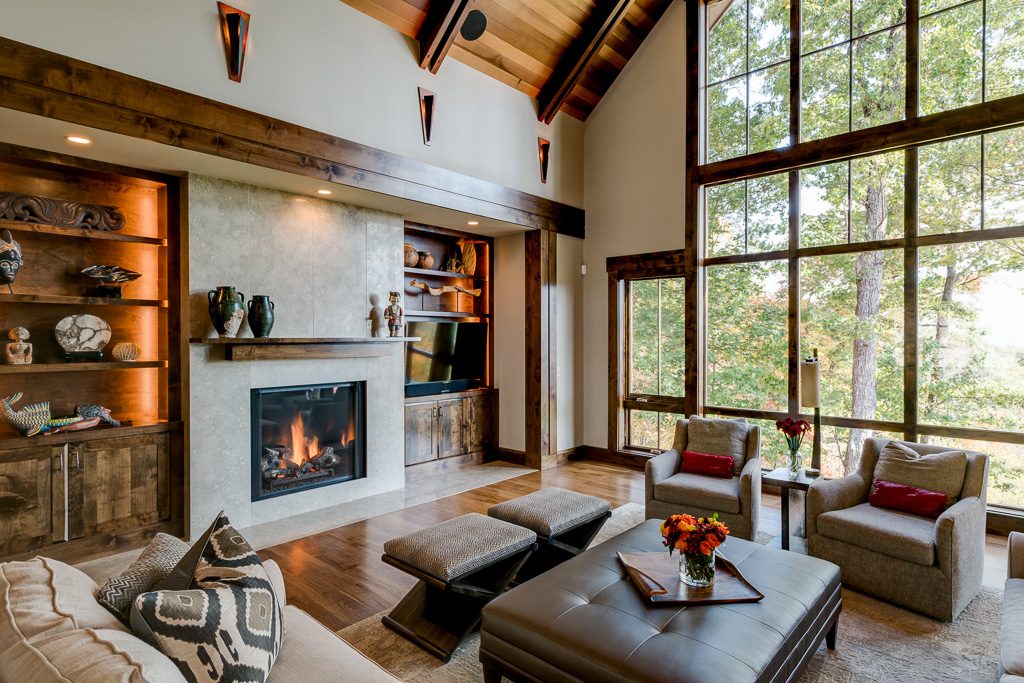This is a custom mountain home located in The Cliffs at Walnut Cove in the Asheville, NC area. We worked with the homeowners, architect, builder & subcontractors during the planning stages and throughout construction. We collaborated on all of the finishes and fixtures, as well as furniture & decor selections. Custom details were designed throughout the home, including the ceilings, fireplace surrounds, cabinetry details, lighting fixtures & features, and tile & stone accents. The home owner’s existing furnishings, artwork & decor were placed throughout the home, and we added in new items from our North Carolina based manufacturers, vendors, artists & artisans. Neutral backgrounds are incorporated with a variety of warm wood tones, and pops of accent color can be changed out over time. The spectacular mountain views take center stage in each room, and can be seen through the glass of the custom front entry doors. Our clients have now relocated from Texas to their new home, and are enjoying their Asheville home and lifestyle!