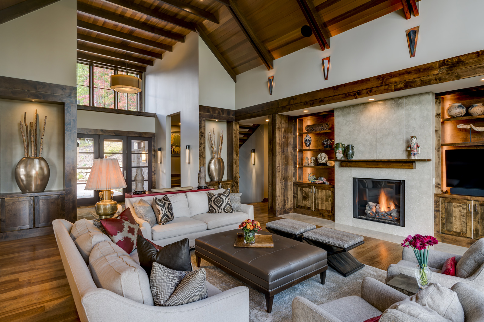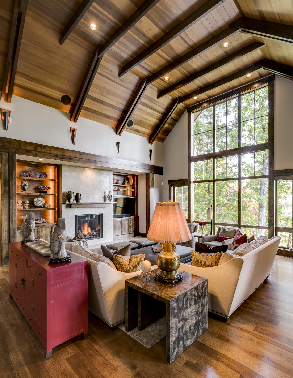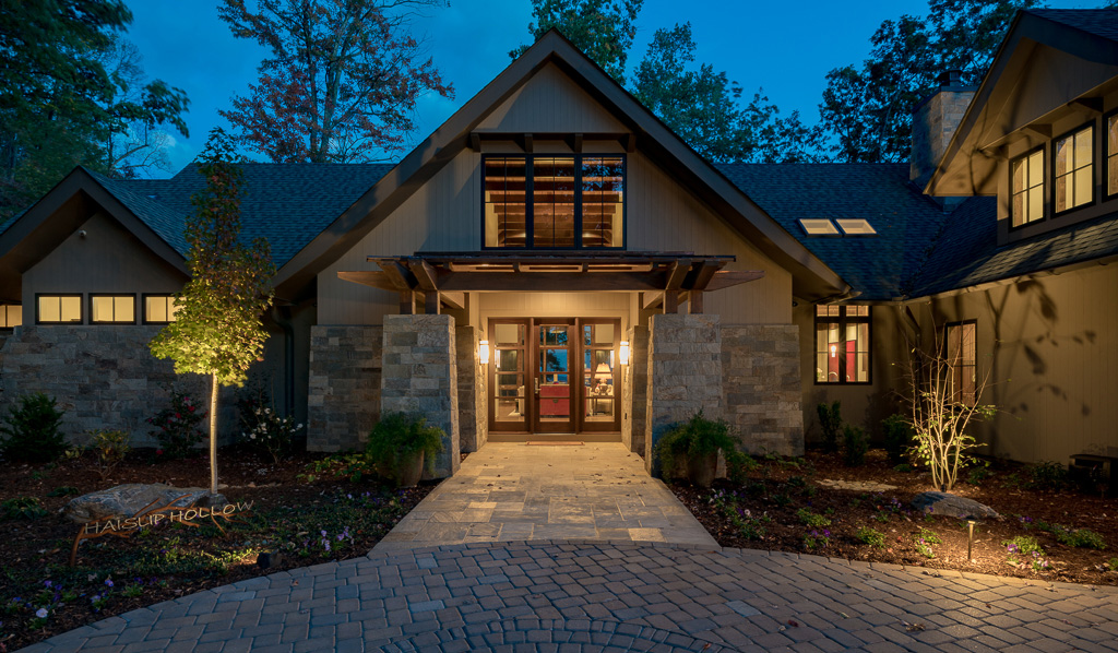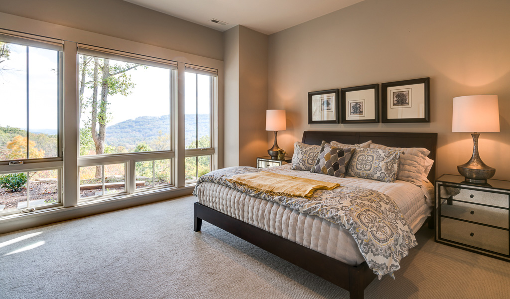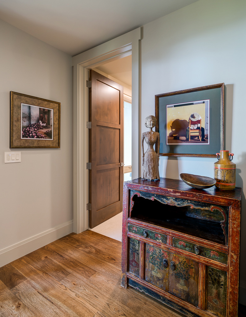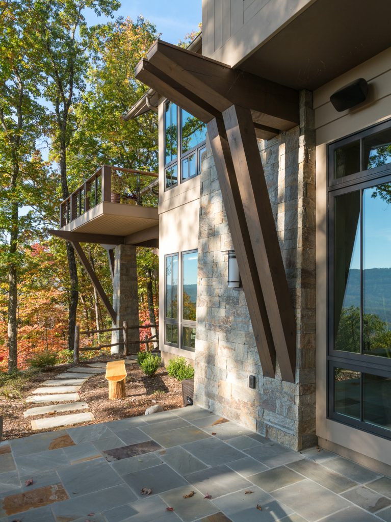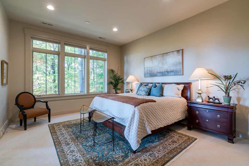 This is a custom mountain home located in The Cliffs at Walnut Cove in the Asheville, NC area. We worked with the homeowners, architect, builder & subcontractors during the planning stages and throughout construction. We collaborated on all of the finishes and fixtures, as well as furniture & decor selections. Custom details were designed throughout the home, including the ceilings, fireplace surrounds, cabinetry details, lighting fixtures & features, and tile & stone accents. The home owner’s existing furnishings, artwork & decor were placed throughout the home, and we added in new items from our North Carolina based manufacturers, vendors, artists & artisans. Neutral backgrounds are incorporated with a variety of warm wood tones, and pops of accent color can be changed out over time. The spectacular mountain views take center stage in each room, and can be seen through the glass of the custom front entry doors. Our clients have now relocated from Texas to their new home, and are enjoying their Asheville home and lifestyle!