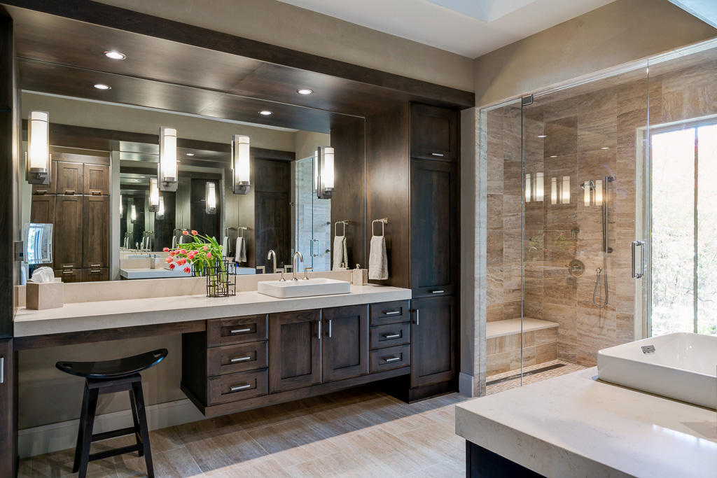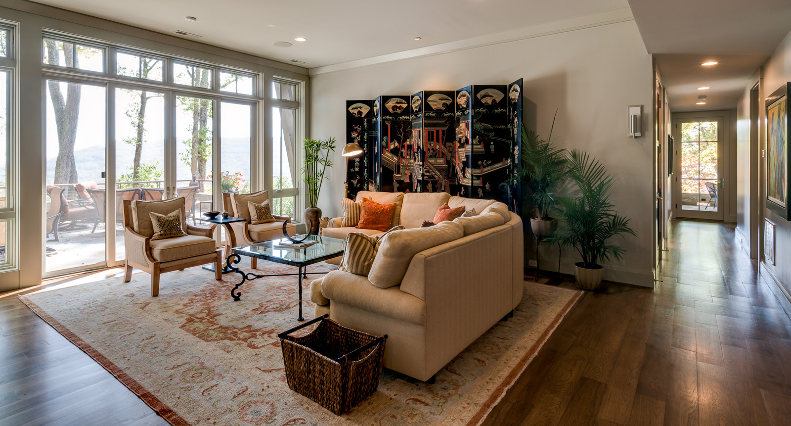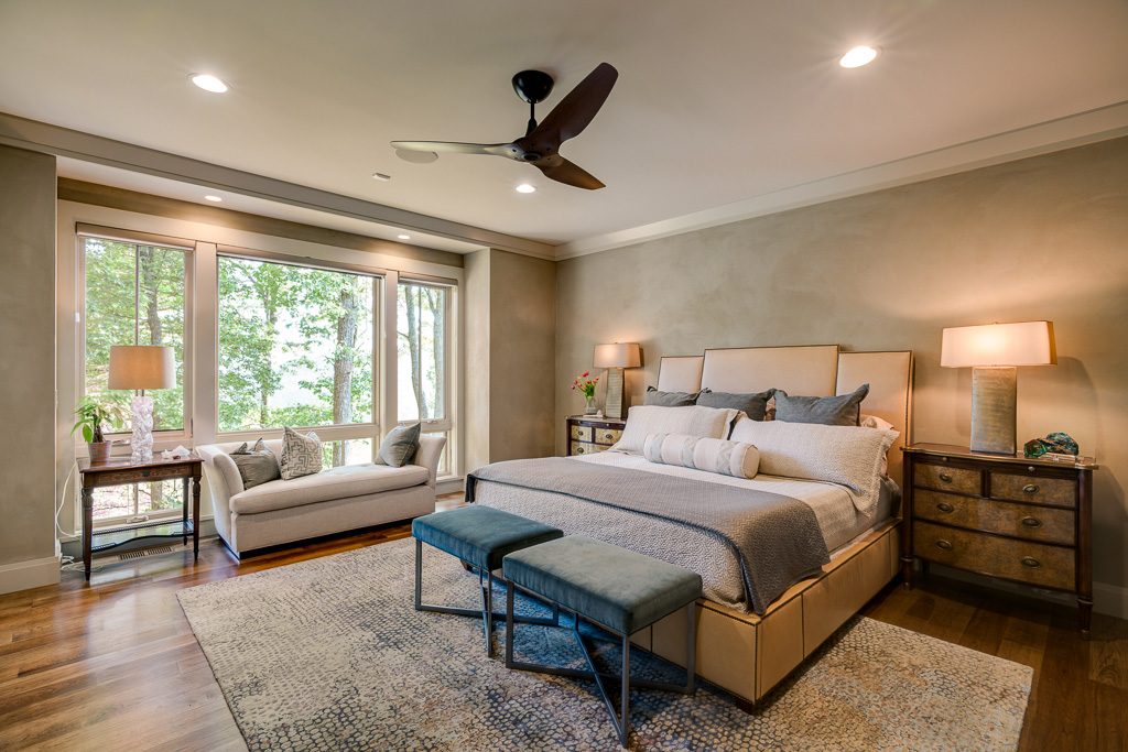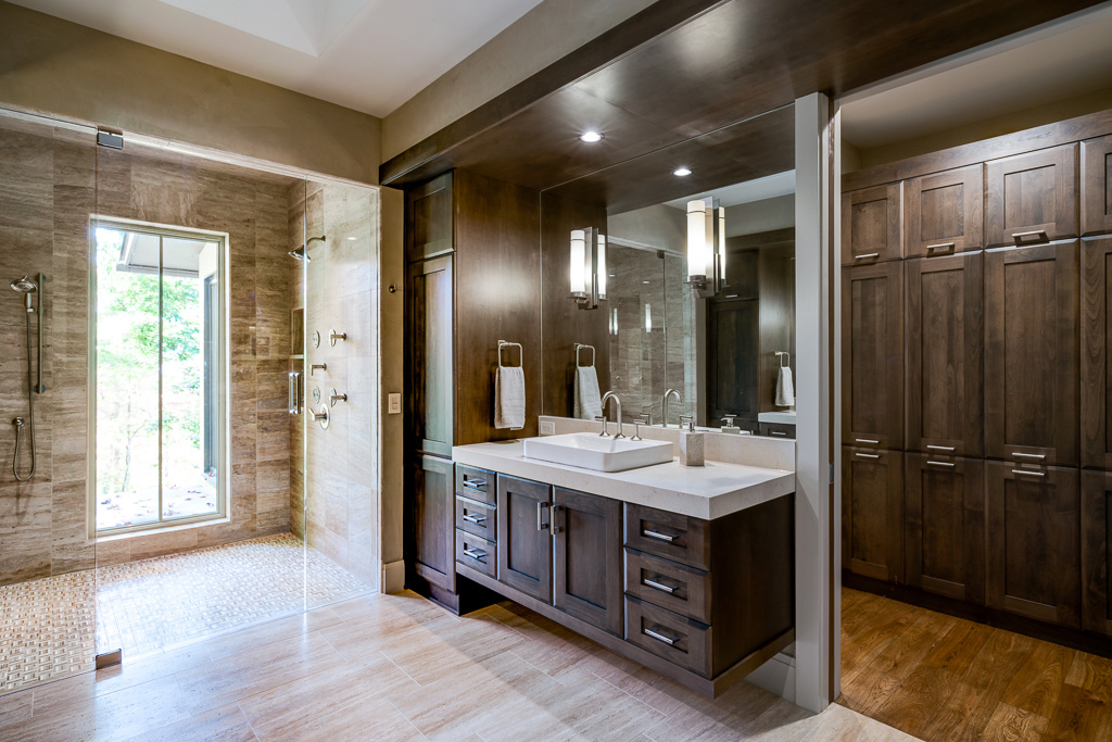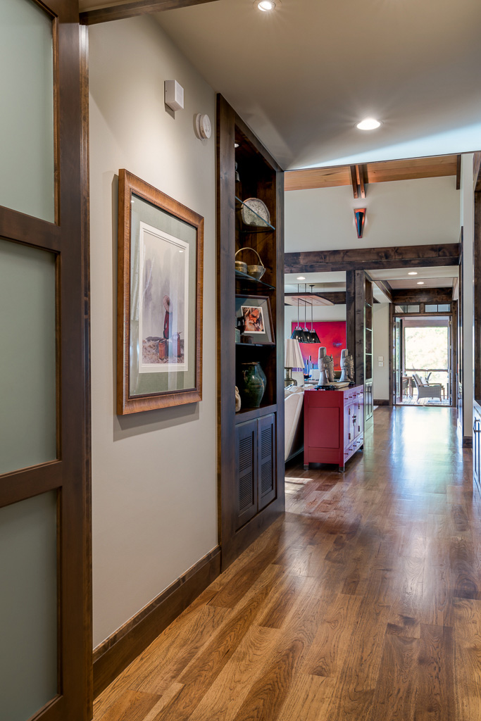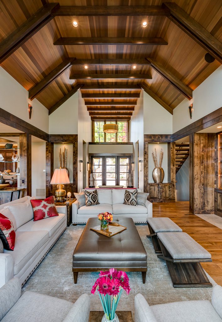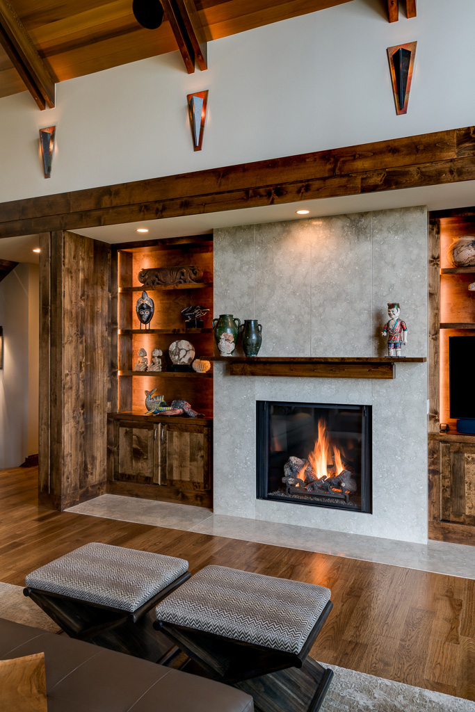 This is a custom mountain home located in The Cliffs at Walnut Cove in the Asheville, NC area. We worked with the homeowners, architect, builder & subcontractors during the planning stages and throughout construction. We collaborated on all of the finishes and fixtures, as well as furniture & decor selections. Custom details were designed throughout the home, including the ceilings, fireplace surrounds, cabinetry details, lighting fixtures & features, and tile & stone accents. The home owner’s existing furnishings, artwork & decor were placed throughout the home, and we added in new items from our North Carolina based manufacturers, vendors, artists & artisans. Neutral backgrounds are incorporated with a variety of warm wood tones, and pops of accent color can be changed out over time. The spectacular mountain views take center stage in each room, and can be seen through the glass of the custom front entry doors. Our clients have now relocated from Texas to their new home, and are enjoying their Asheville home and lifestyle!